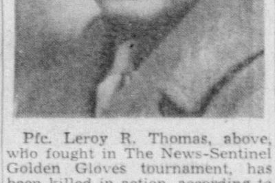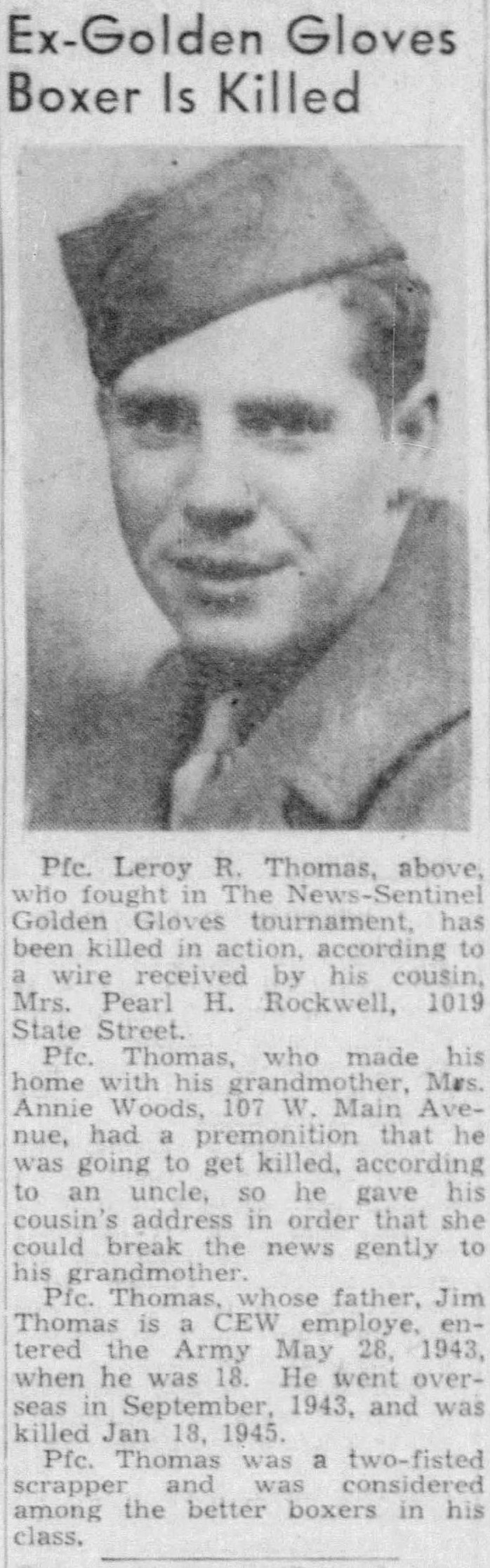 Pfc. Leroy R. Thomas, who fought in The News-Sentinel Golden Gloves tournament, has been killed in action, according to a wire received by his cousin, Mrs. Pearl H. Rockwell, 1019 State Street. Pfc. Thomas, who made his home with his grandmother, Mrs. Annie Woods, 107 W. Main Avenue, had a premonition that he was going to get killed, according to an uncle, so he gave his cousin’s address in order that she could break the news gently to his grandmother. Pfc. Thomas, whose father, Jim Thomas is a CEW employe, entered the Army May 28, 1943, when he was 18. He went overseas in September, 1943, and was killed Jan. 18, 1945