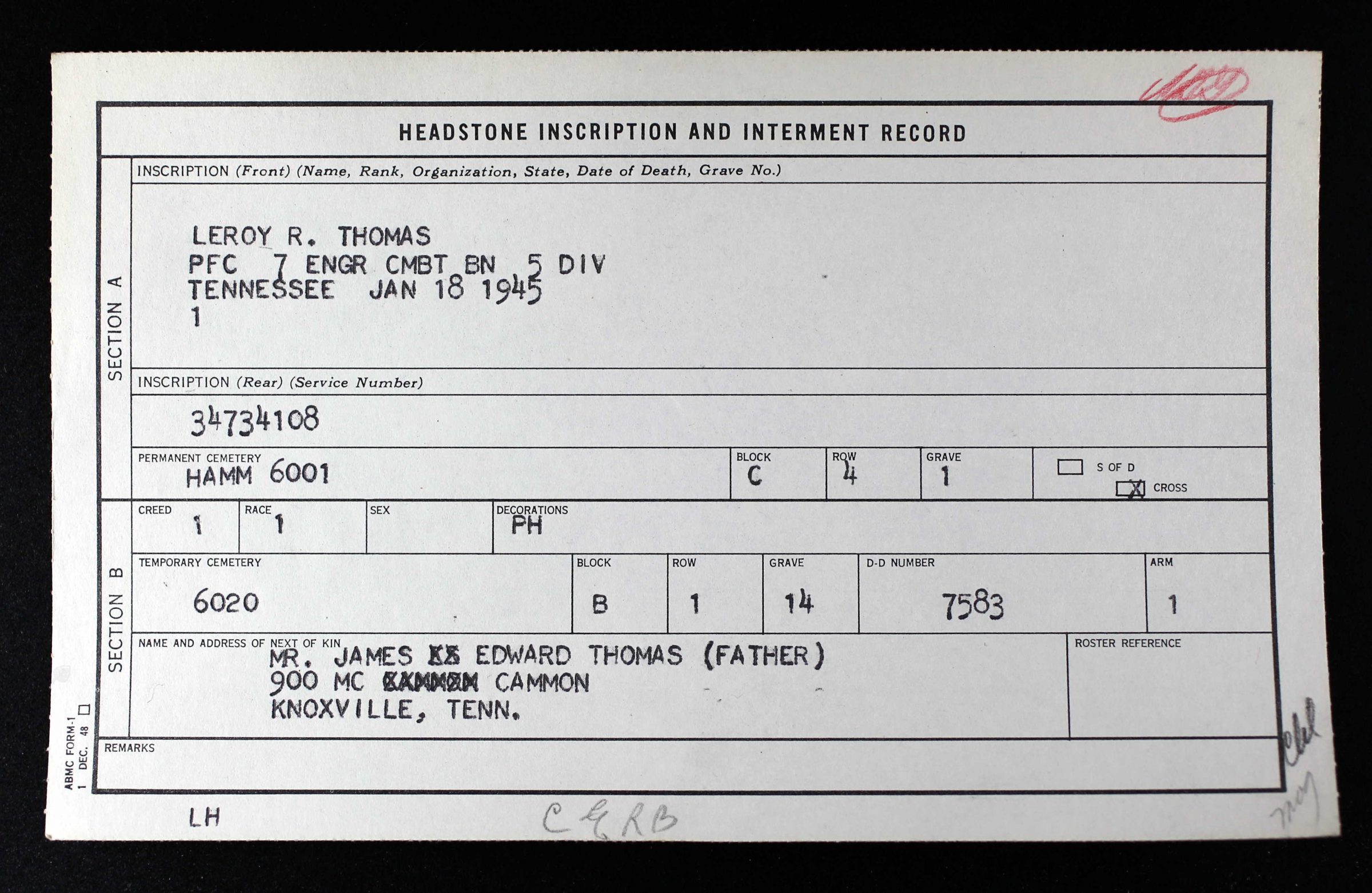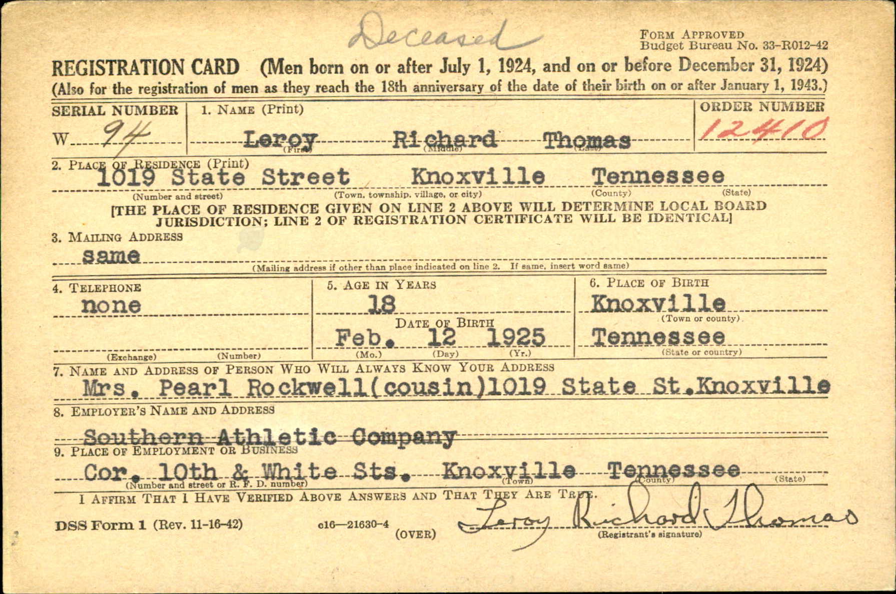 Leroy Richard Thomas was born in Knoxville, Tennessee. He enlisted on May 21, 1943, in Fort Oglethorpe, GA