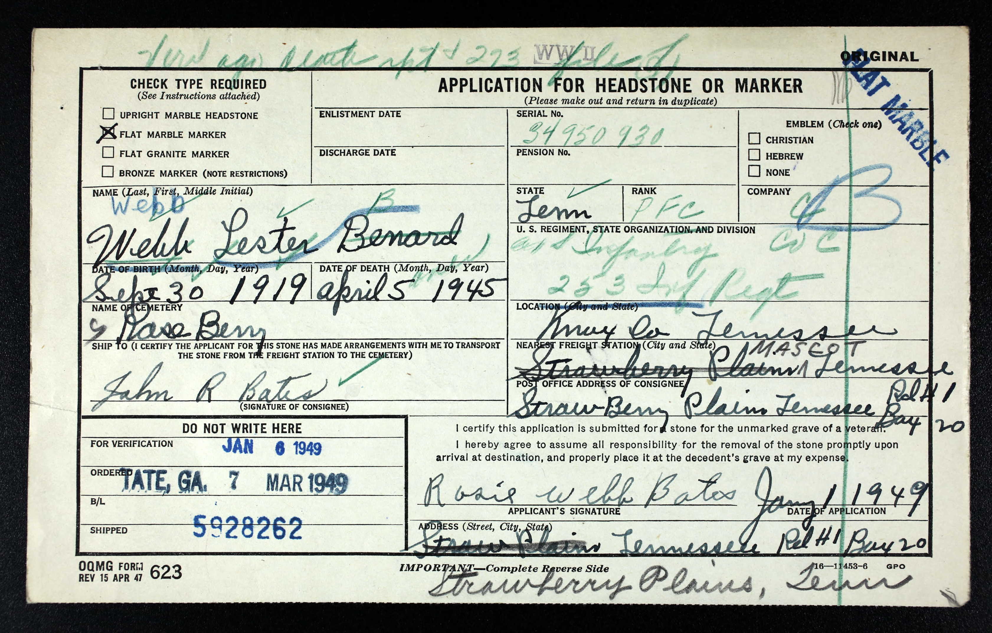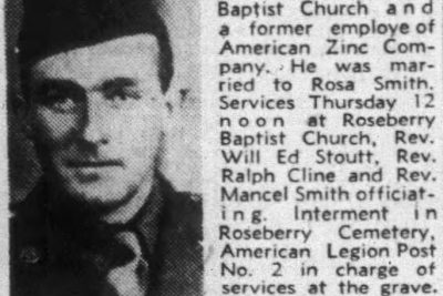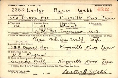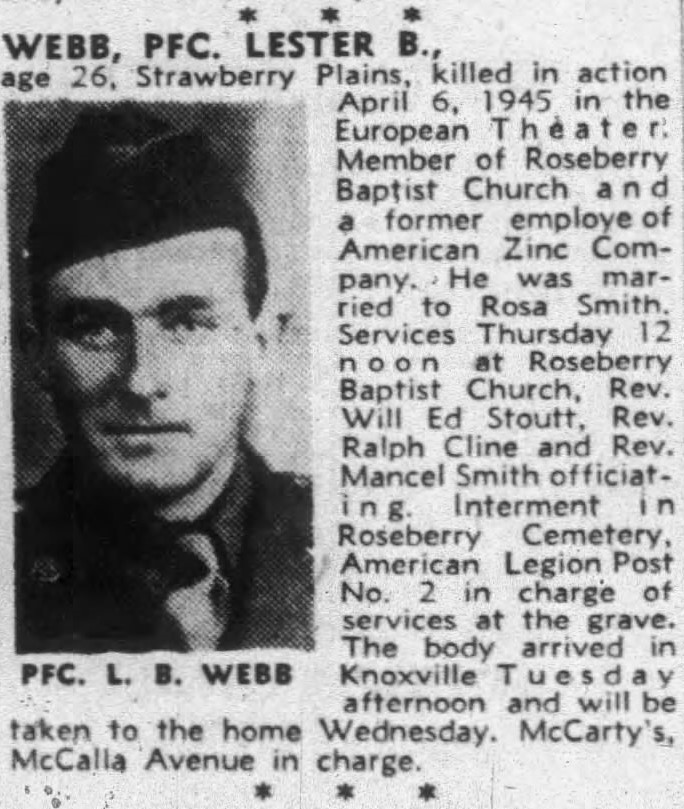 Pfc. Lester B. Webb, age 26, Strawberry Plains, killed in action April 6, 1945 in the European Theater. Member of Roseberry Baptist Church and a former employe of American Zinc Company. He was married to Rosa Smith.