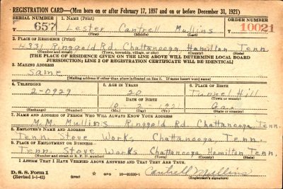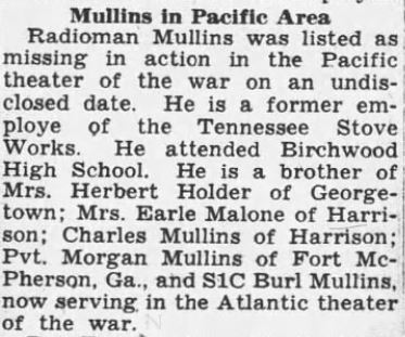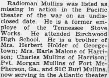 Radioman 2C Lester Cantrell Mullins, 25, son of Mr. and Mrs. Lester Mullins of Harrison, was listed as missing in the Pacific theater on a undisclosed date. He is a former employe of the Tennessee Stove Works. He attended Birchwood High School. He is a brother of Mrs. Herbert Holder of Georgetown; Mrs. Earle Malone of Harrison; Charles Mullins of Harrison; Pvt. Morgan Mullins of Fort McPherson, Ga., and S1C Burl Mullins, now serving in the Atlantic theater of war.