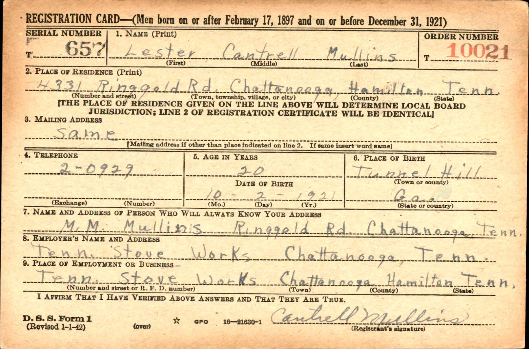Lester Cantrell “Jabo”Mullins was born in Catoosa, Georgia to William Lester Mullins and Mary Myrtle Morgan.