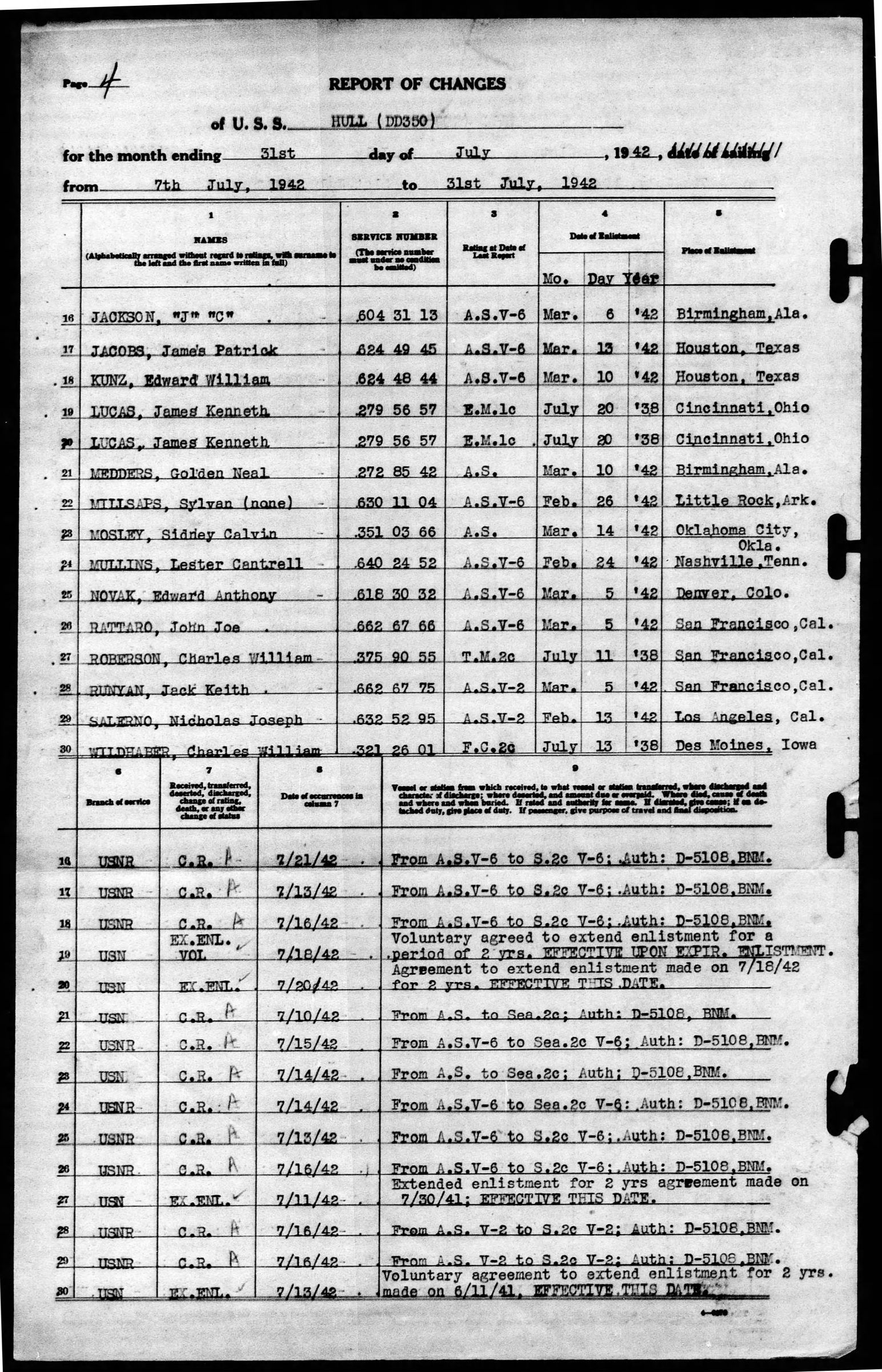Lester Mullins served on the USS Hull. On December 18, 1944, typhoon COBRA caught the USS Hull, USS Monaghan and USS Spence. The three destroyers capsized and sank with 790 dead or missing, 26 other vessels seriously damaged and 146 aircraft destroyed.