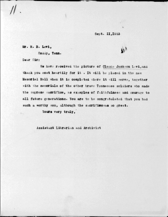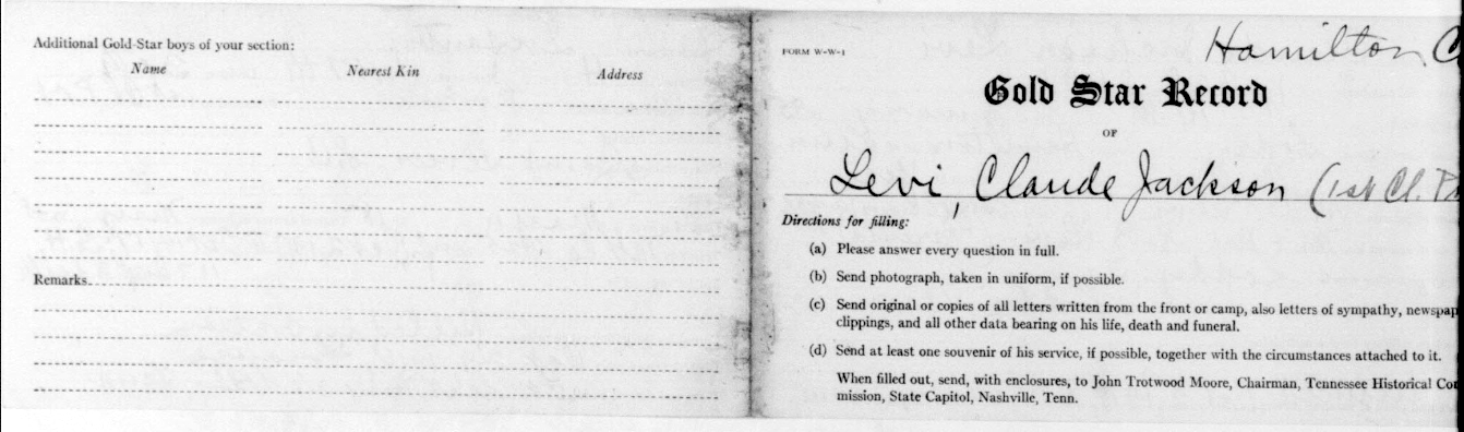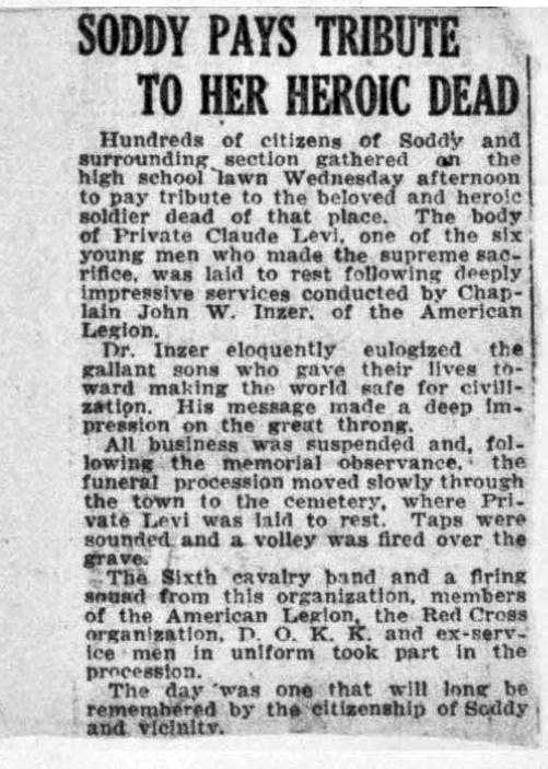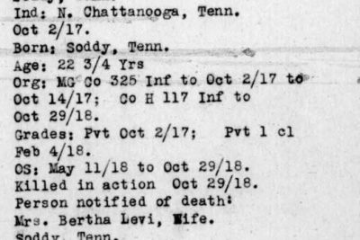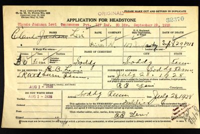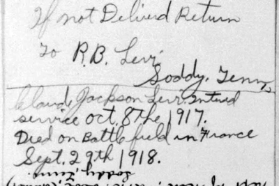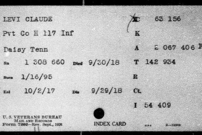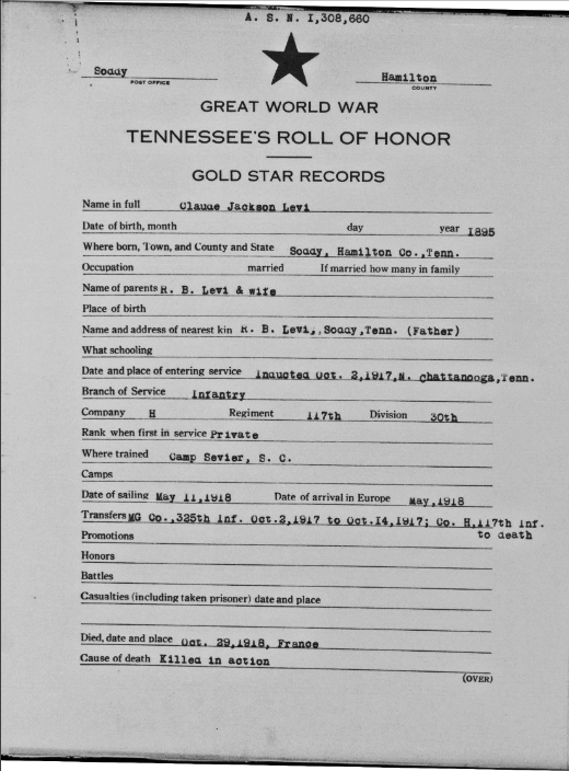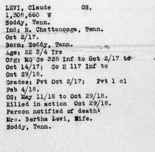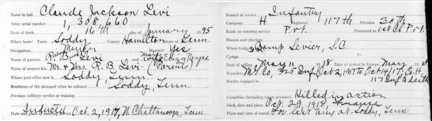 Claude Jackson Levi was born in Soddy, Tennessee, son of Mary Eliza Payne and husband of Bertha Levi. He was killed in action in France 29 September 1918.