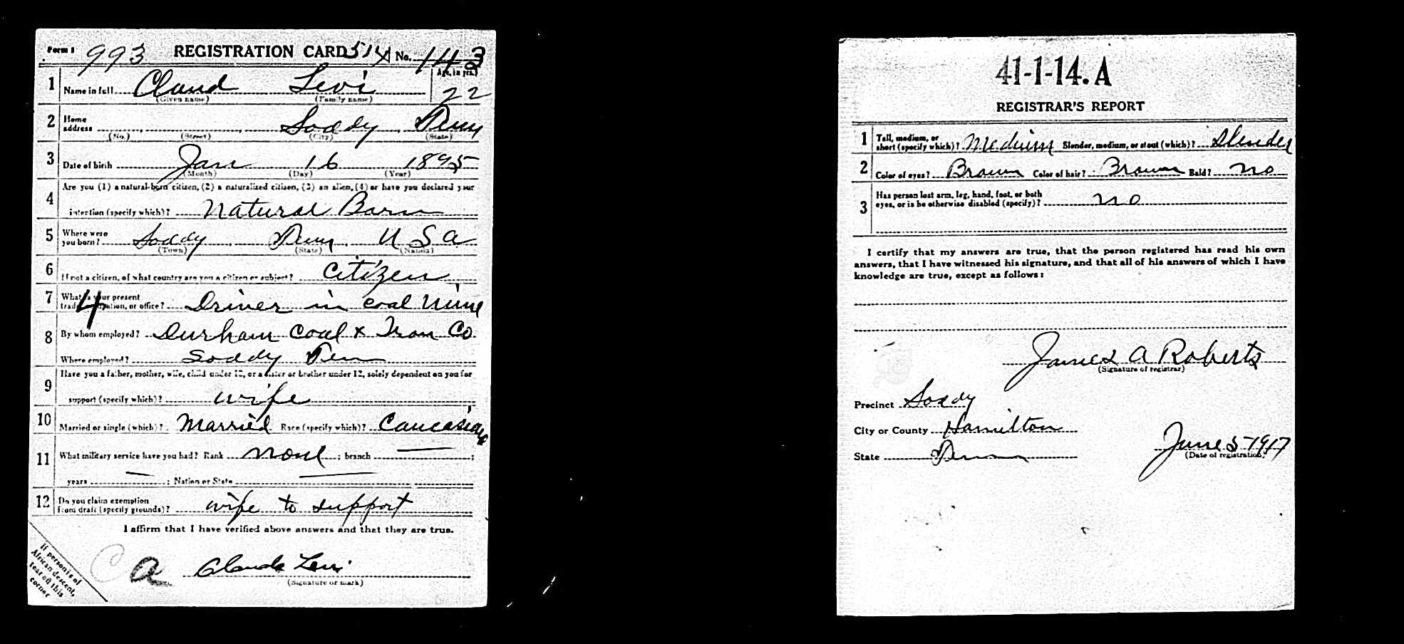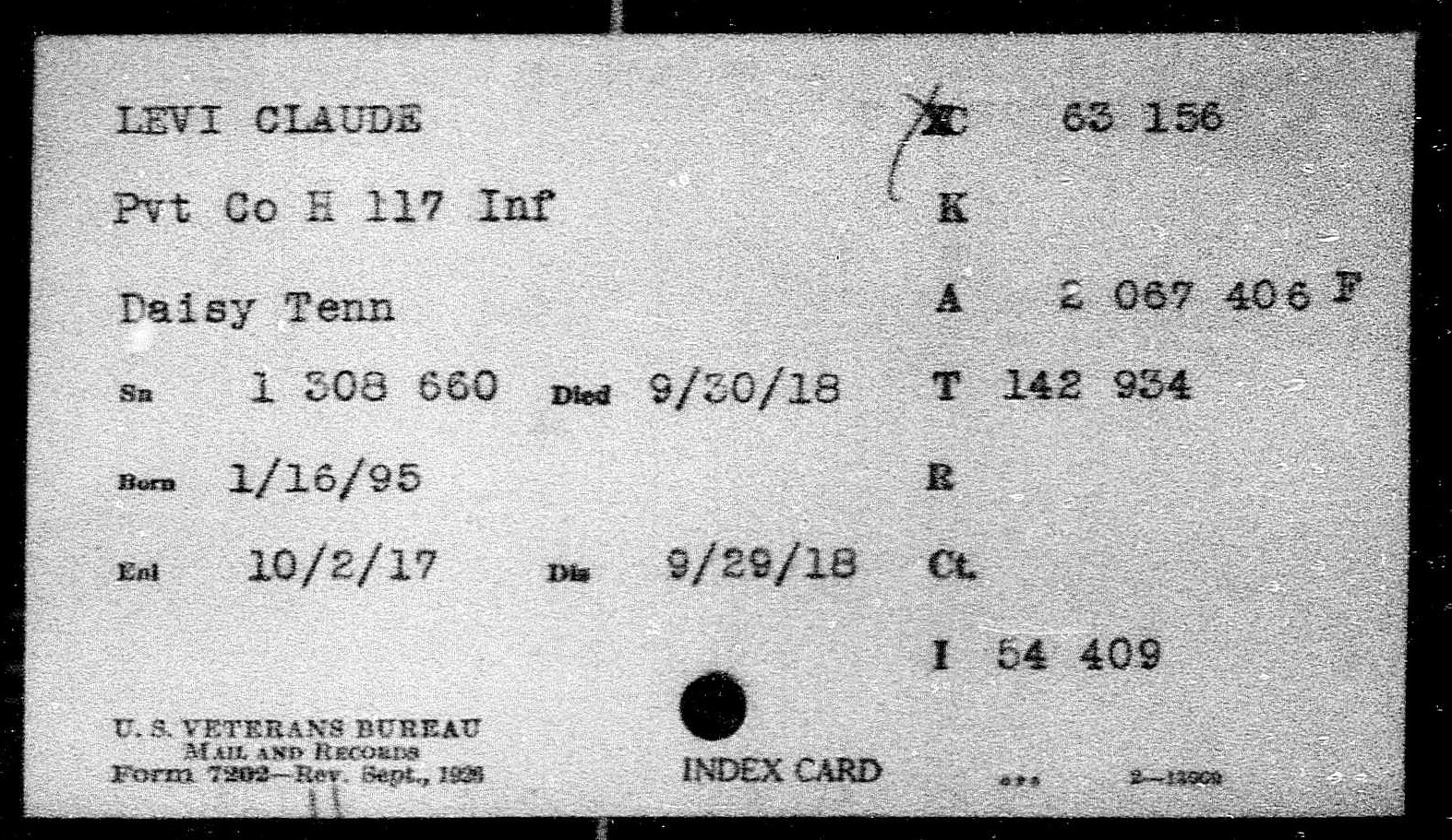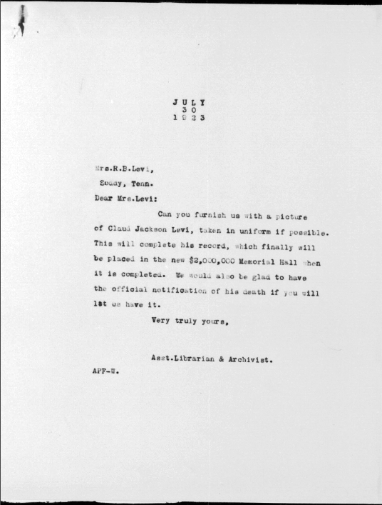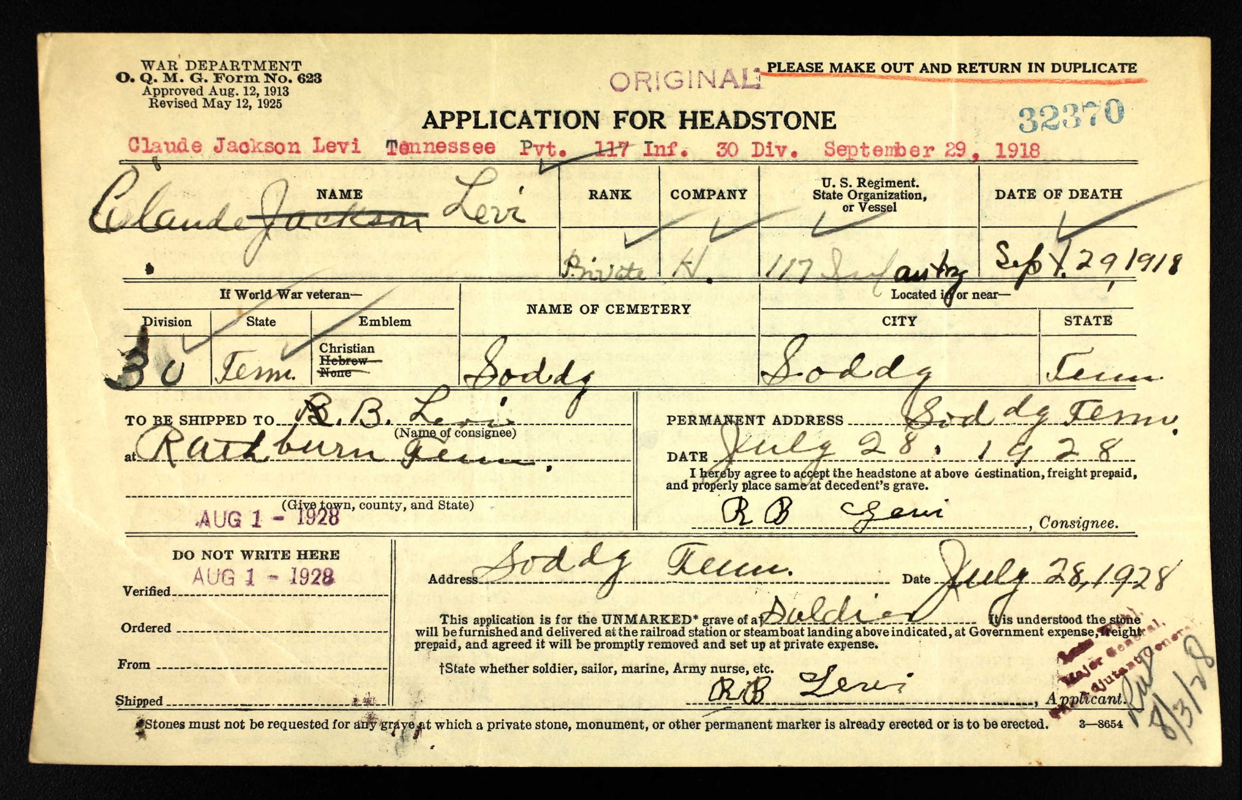 Claude Jackson Levi was born in Soddy, Tennessee, son of Mary Eliza Payne and husband of Bertha Levi. He was killed in action in France 29 September 1918.
