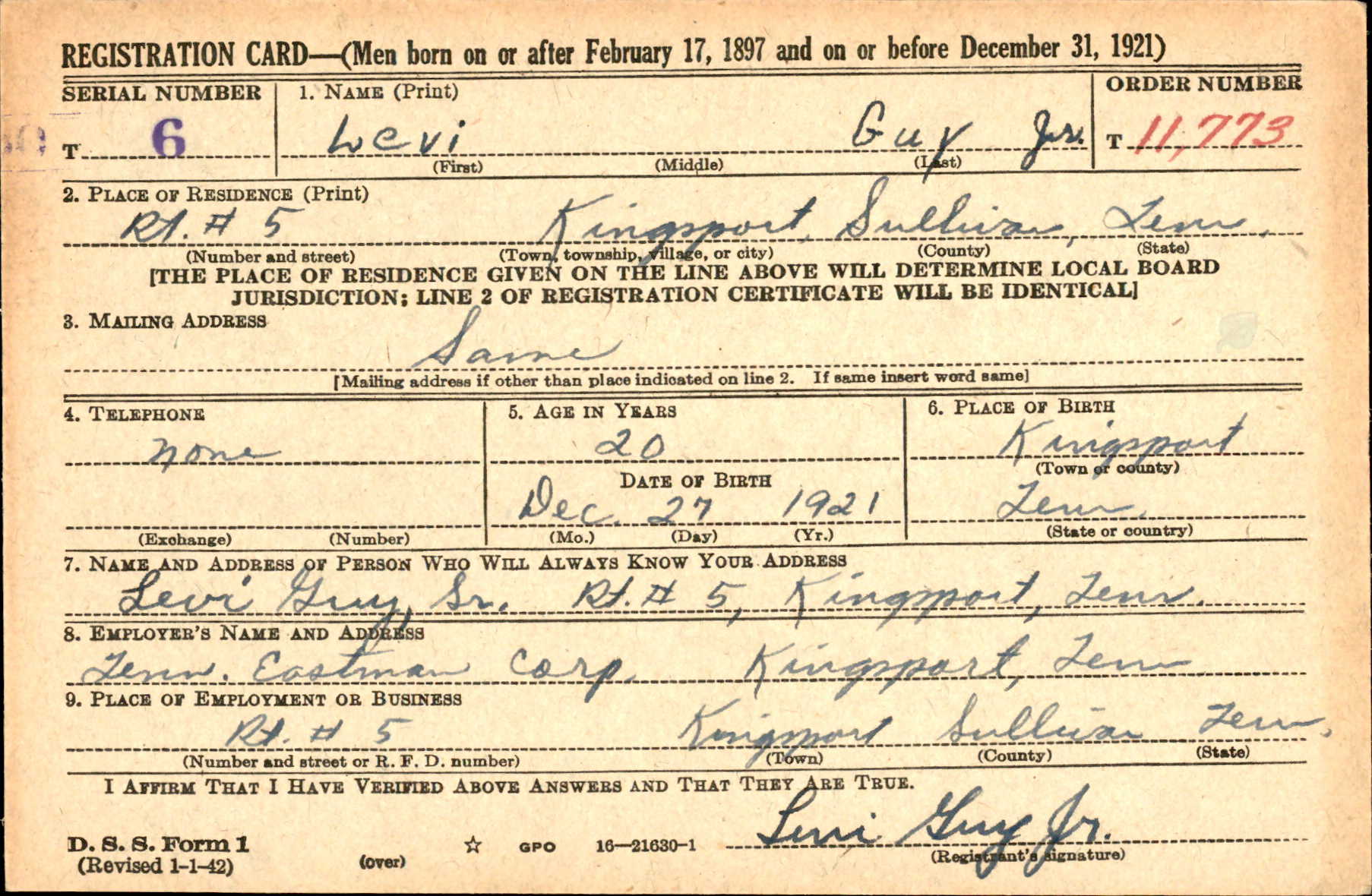 Levi Guy Jr. was born on 25 December 1921 in Kingsport, Tennessee. He was the son of Levi Harrison Guy and Lillian Terry.