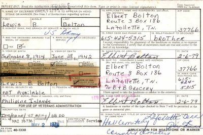 Private Lewis B. Bolton was assigned to the 21st Pursuit Squadron, 24th Pursuit Group. At the start of the war the unit was based in the Philippines and with the loss of its aircraft, was eventually part of the defense of Bataan and Corregidor as infantry. He was listed as Died Non Battle on 28 June 1942. He died as a POW of the Japanese Army at POW Camp 1, Cabanatuan 1-2-3, Nueva Province, Luzon, Philippines 15-121 and is listed on the Tablets of the Missing, Manila American Cemetery, Philippines.