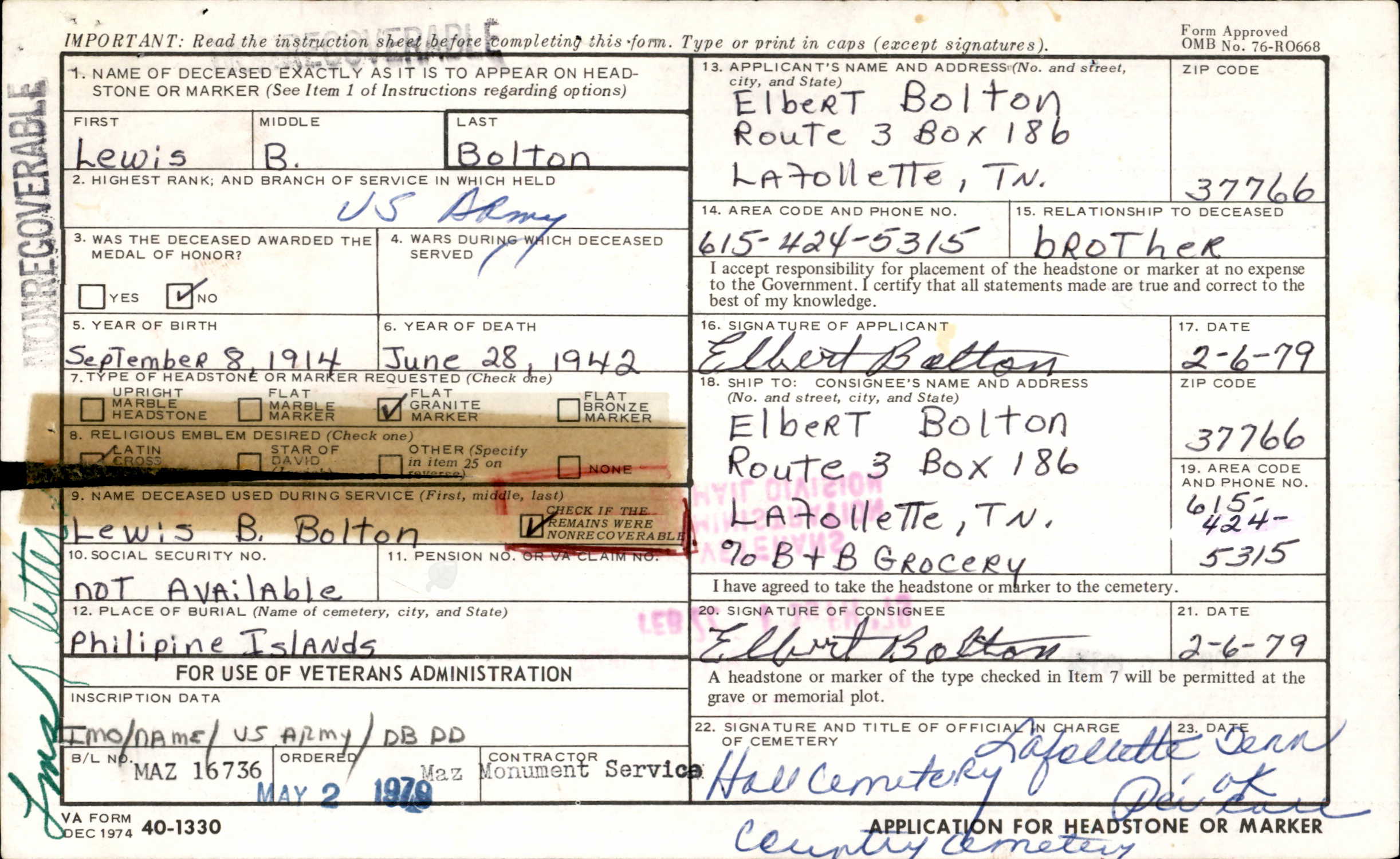 Private Lewis B. Bolton was assigned to the 21st Pursuit Squadron, 24th Pursuit Group. At the start of the war the unit was based in the Philippines and with the loss of its aircraft, was eventually part of the defense of Bataan and Corregidor as infantry. He was listed as Died Non Battle on 28 June 1942. He died as a POW of the Japanese Army at POW Camp 1, Cabanatuan 1-2-3, Nueva Province, Luzon, Philippines 15-121 and is listed on the Tablets of the Missing, Manila American Cemetery, Philippines.