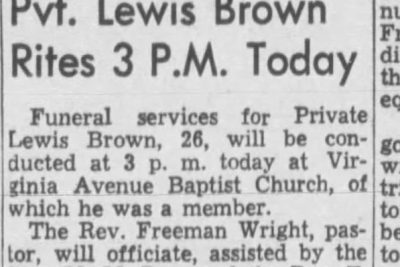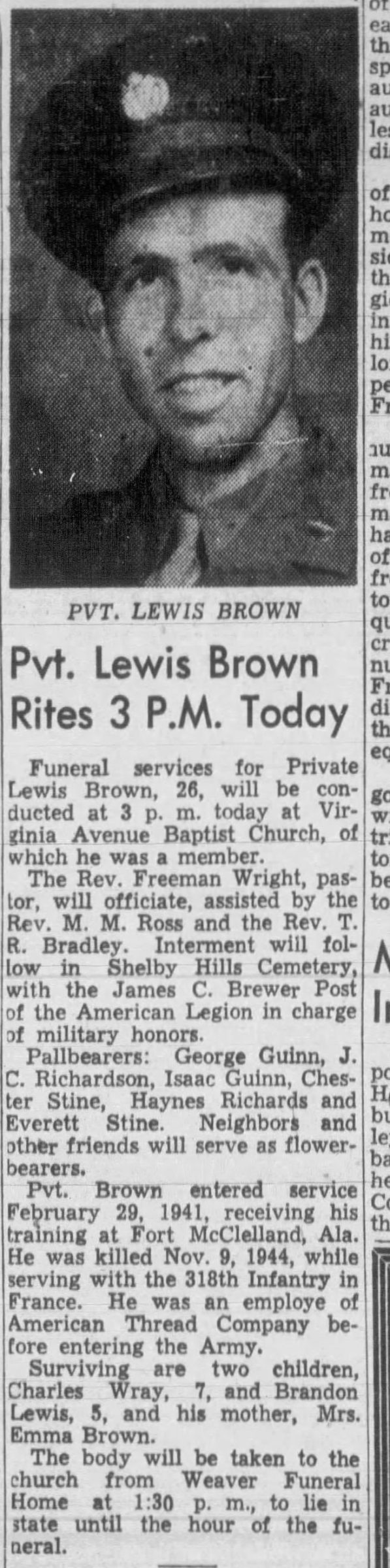 Pvt. Lewis Brown, only son of Mrs. Emma Brown of the Weaver Pike, was killed in action in France on November 9, his wife, Mrs. Cordie Brown, has been informed by the War Department. Pvt. Brown entered the service in April, 1944, and trained at Fort McClellan, Alabama. He had been overseas since September 27. Brown was an employe of the American Thread company. He is survived by his wife, his mother and two children, Charles Wray, 3, and Brandon Lewis, 20 months.