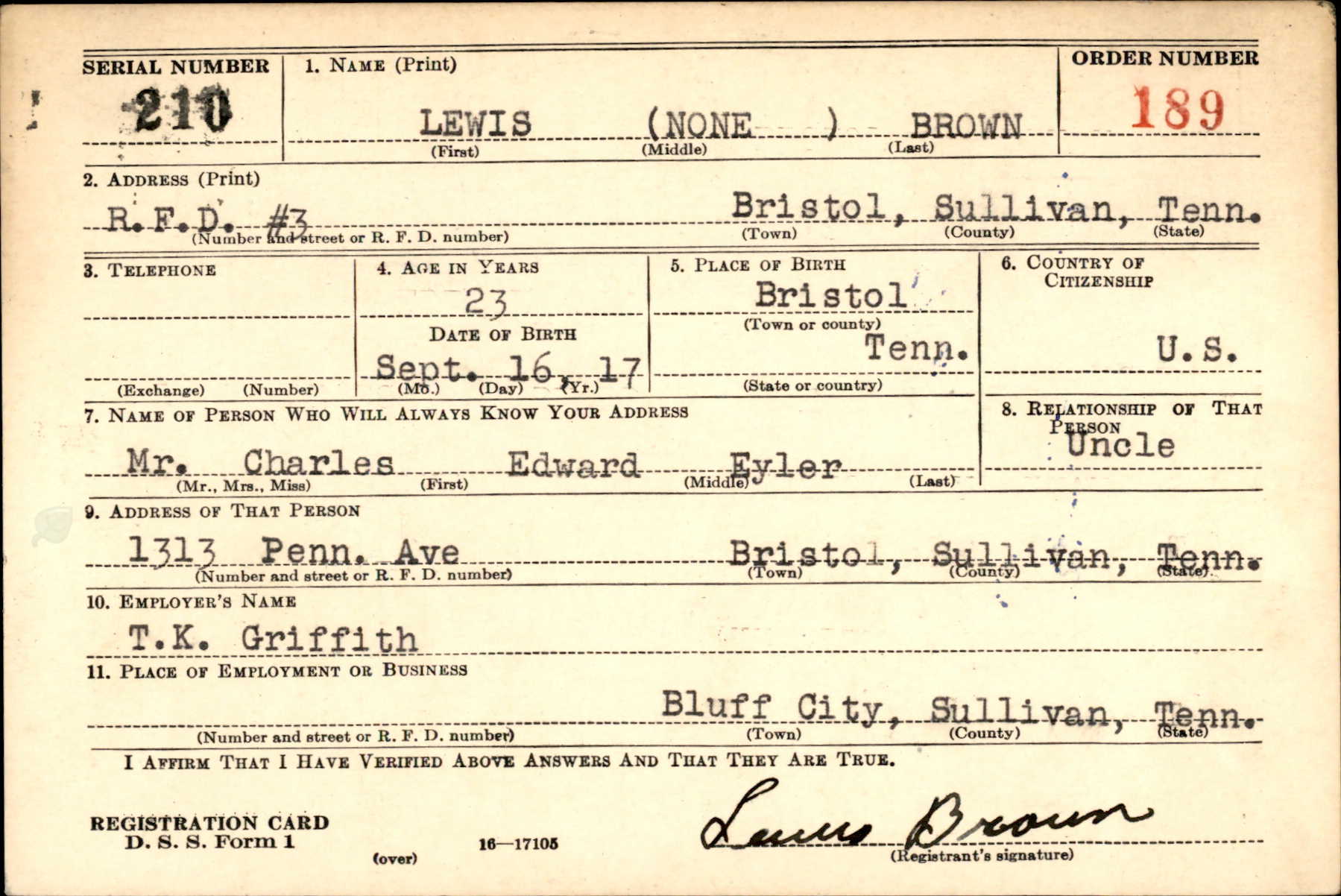 Private Lewis Brown was born 16 September 1917 in Bristol, Tennessee. He enlisted on 11 March 1944 at Camp Shelby, Mississippi. He was killed in action 9 November 1944 while serving with the 318th Infantry in France.