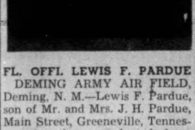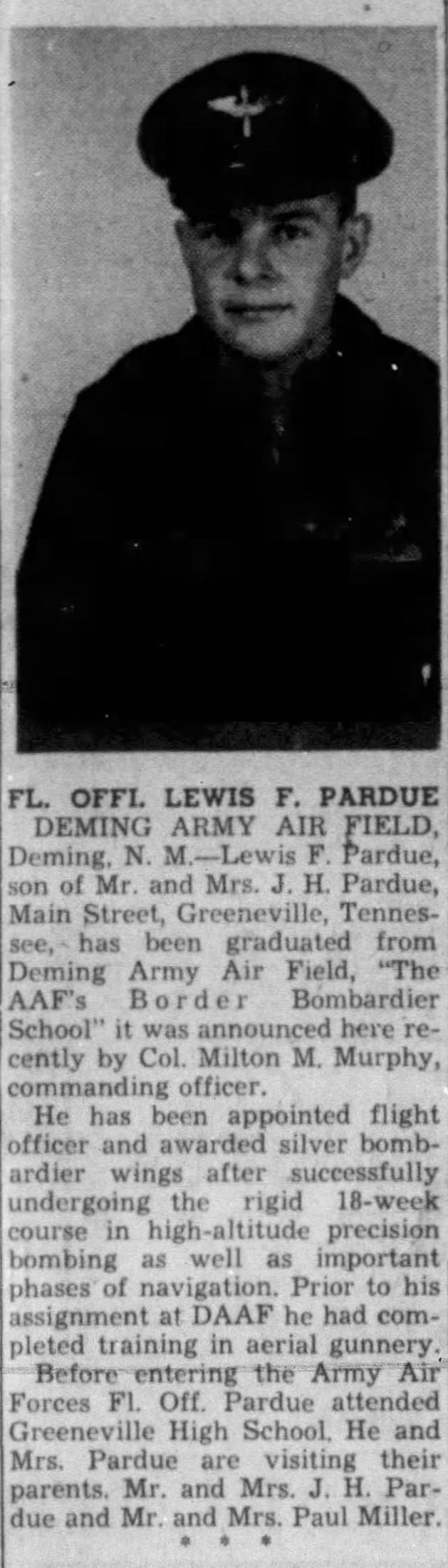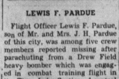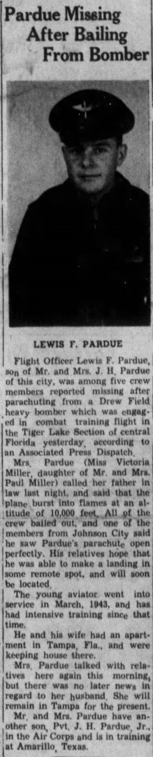 Flight Officer Lewis F. Pardue, son of Mr. and Mrs. J.H. Pardue of this city, was among five crew members reported missing after parachuting from a Drew Field heavy bomber which was engaged in combat training flight in the Tiger Lake Section of Central Florida yesterday, according to an Associated Press Dispatch. Mrs. Pardue (Miss Victoria Miller, daughter of Mr. and Mrs. Paul Miller) called her father in law last night, and said that the plane burst into flames at an altitude of 10,000 feet. All of the crew bailed out, and one of the members from Johnson City said he saw Pardue’s parachute open perfectly. His relatives hope that he was able to make a landing in some remote spot, and will soon be located. The young aviator went into service in March, 1943, and has had intensive training since that time. He and his wife had an apartment in Tampa, Fla., and were keeping house there. Mrs. Pardue talked with relatives here again this morning, but here was not later news in regard to her husband. She will remain in Tamp for the present. Mr. and Mrs. Pardue have another son, Pvt. J.H. Pardue, Jr., in the Air Corps and is in training at Amarillo, Texas.