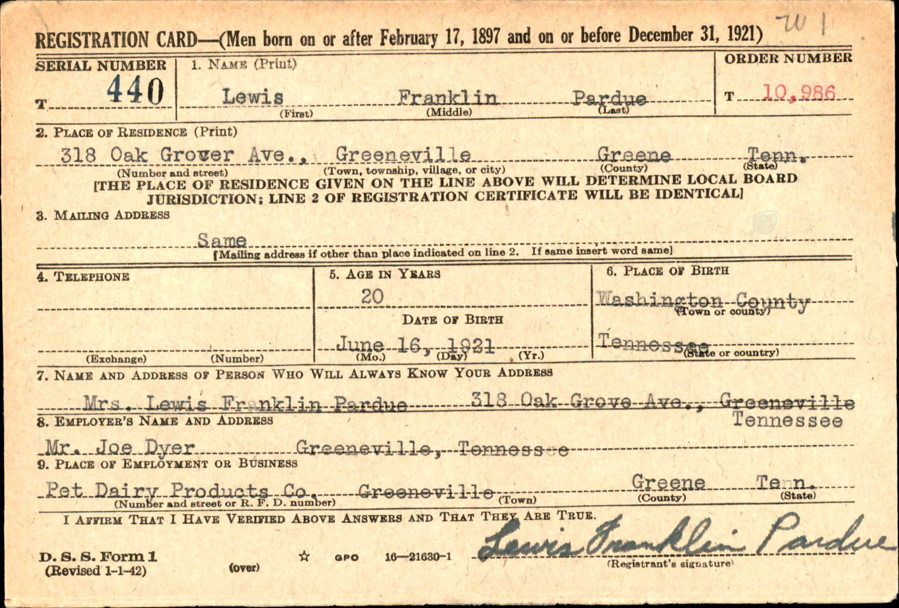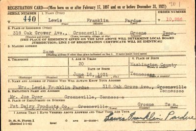 Lewis Franklin Pardue was born in Washington County, Tennessee, the son of John Houston Pardue and Ada Pearl Murray. Husband of Victoria Miller.