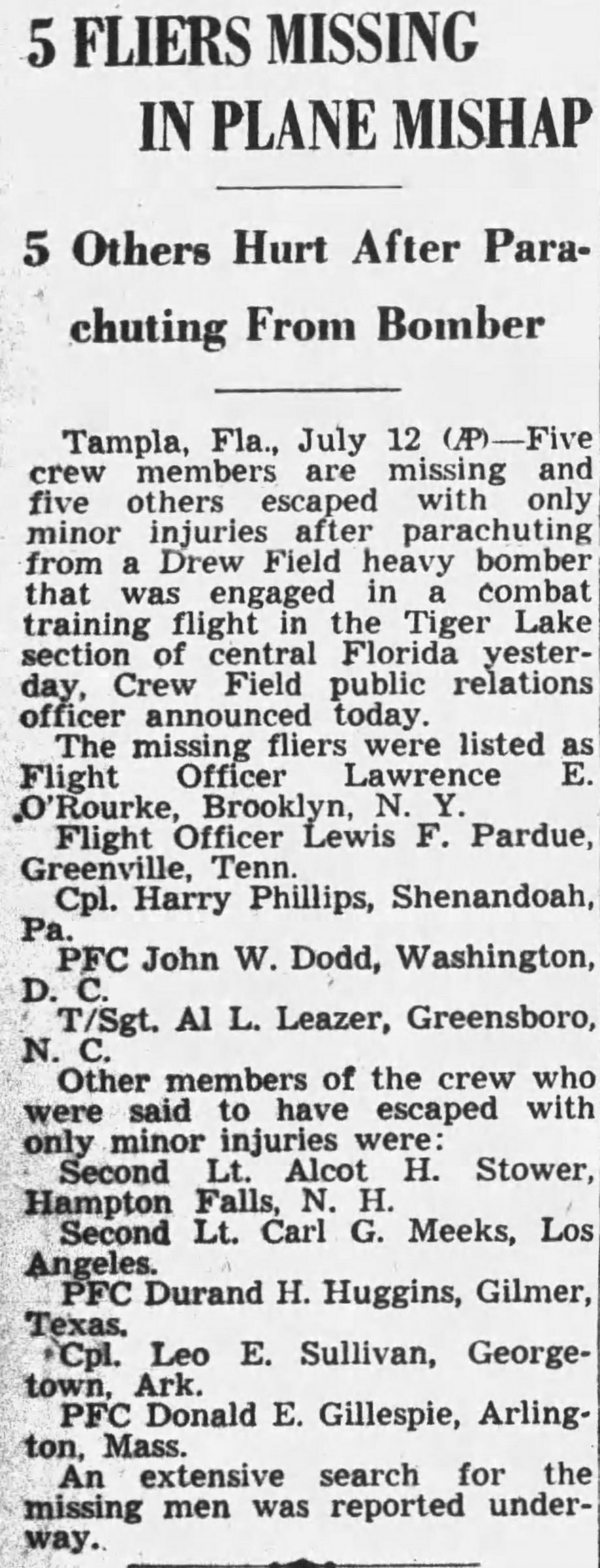Tampla, Fla., July 12 1944 – Five crew members are missing and five others escaped with only minor injuries after parachuting form a Drew Field heavy bomber that was engaged in a combat training flight in the Tiger Lake section of central Florida yesterday, Crew Field public relations offficer announced today.