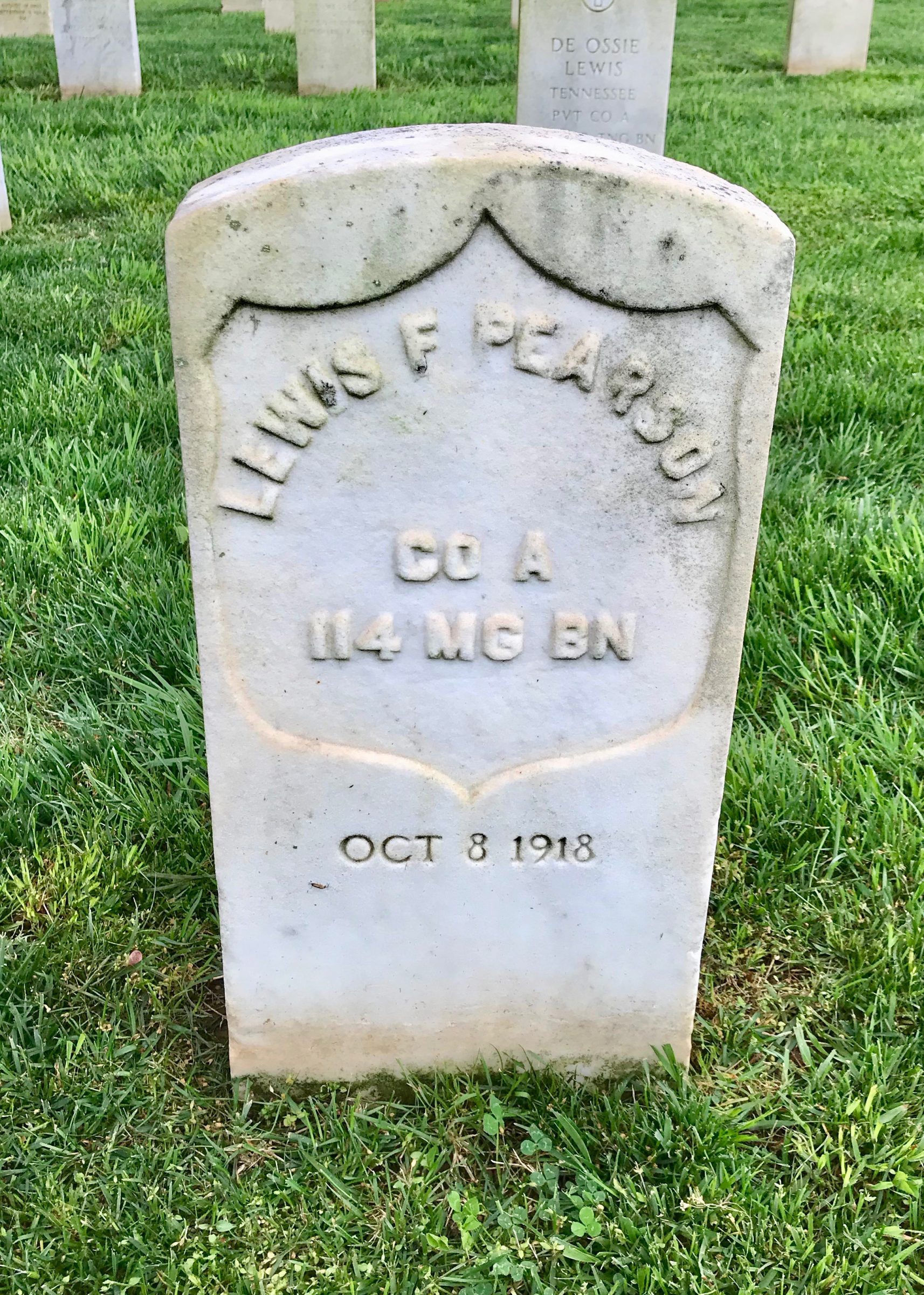 Leewis French Pearson was born on 8 October 1890 at Tazewell, Tennessee to Lewis Tipton Pearson and Alice L. Barnard. He was killed in action on 8 October 1918 at the age of 28. Pvt Pearson was initially buried at the American Cemetery, Bony, Aisne in France. Buried at Knoxville National Cemetery, B 19, 3728