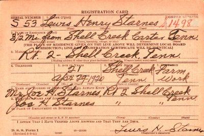 Starnes entered the service October 22, 1941, took his training at Fort Benning, Georgia, Camp Croff, and Fort Jackson, South Carolina. After taking his training he was sent to New Caledonia in the Pacific where he took part in several major engagements. He was wounded fatally in Italy April 26, 1944, and died in a German hospital the next day. L.T. Starnes served with the 69th Infantry. Survivors are his parents, Mr. and Mrs. J.H. Starnes of Roan Mountain; two brothers, Lee Starnes of Elizabethton, and James Starnes of Roan Mountain; four sisters, Mrs. Missouria Starnes, Mrs. G.B. Baker, and Janet Ann Starnes, all of Roan Mountain and Mrs. Edward Scott of Shell Creek; and a grandfather, James Harrison of Shell Creek.