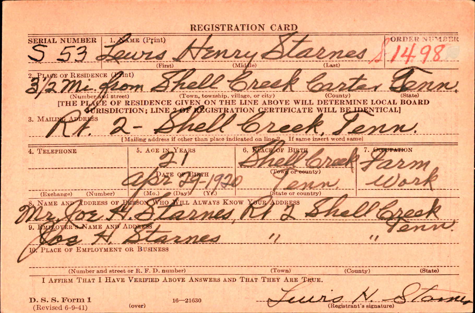 Lewis Henry Starnes was born on 29 April 1920, the son of Joseph Hardin “Dewey” Starnes and Dora Alice Harrison.