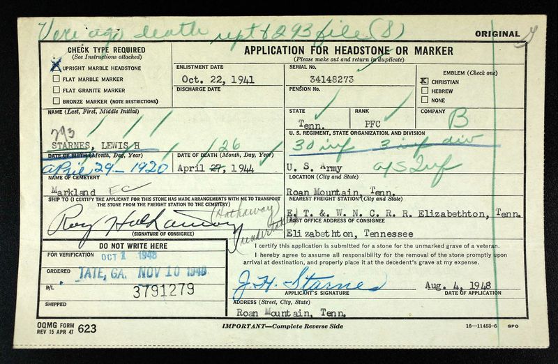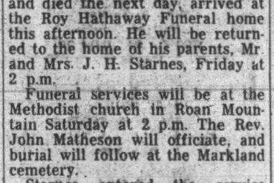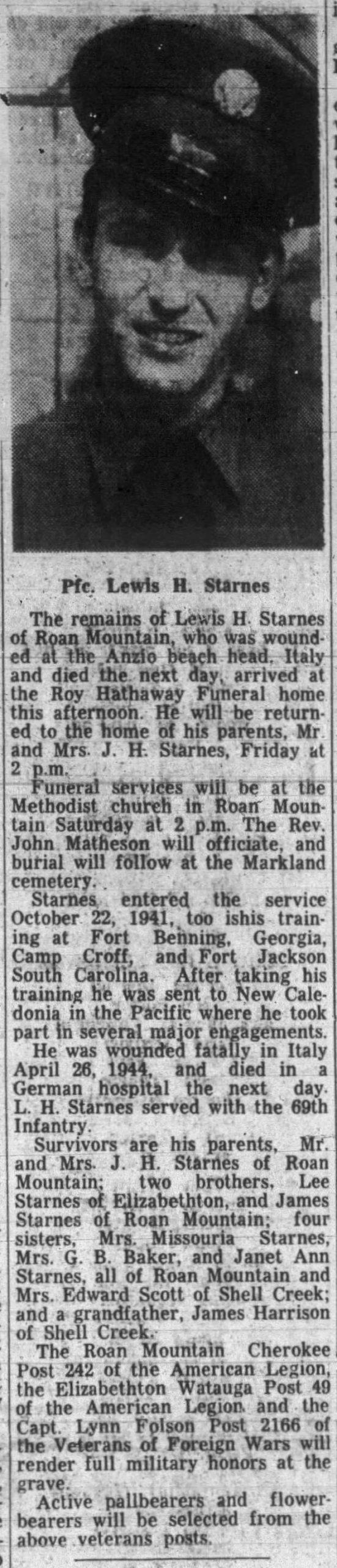 The remains of Lewis H. Starnes of Roan Mountain, who was wounded at the Anzio beach head, Italy and died the next day, arrived at the Roy Hathaway Funeral home this afternoon. He will be returned to the home of his parents, Mr. and Mrs. J.H. Starnes. Funeral services will be at the Methodist church in Roan Mountain and burial will follow at the Markland cemetery.