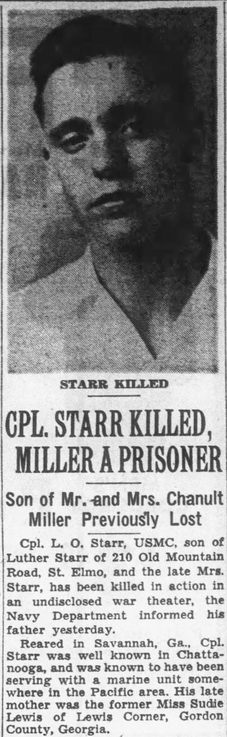 Cpl. L.O. Starr, marine, son of Luther Starr, 201 Old Mountain Road, St. Elmo, and the late Mrs. Starr, has been killed in action in the Pacific theater. Cpl. Starr’s late mother was the former Miss Sudie Lewis of Lewis Corner, Gordon County, Georgia.