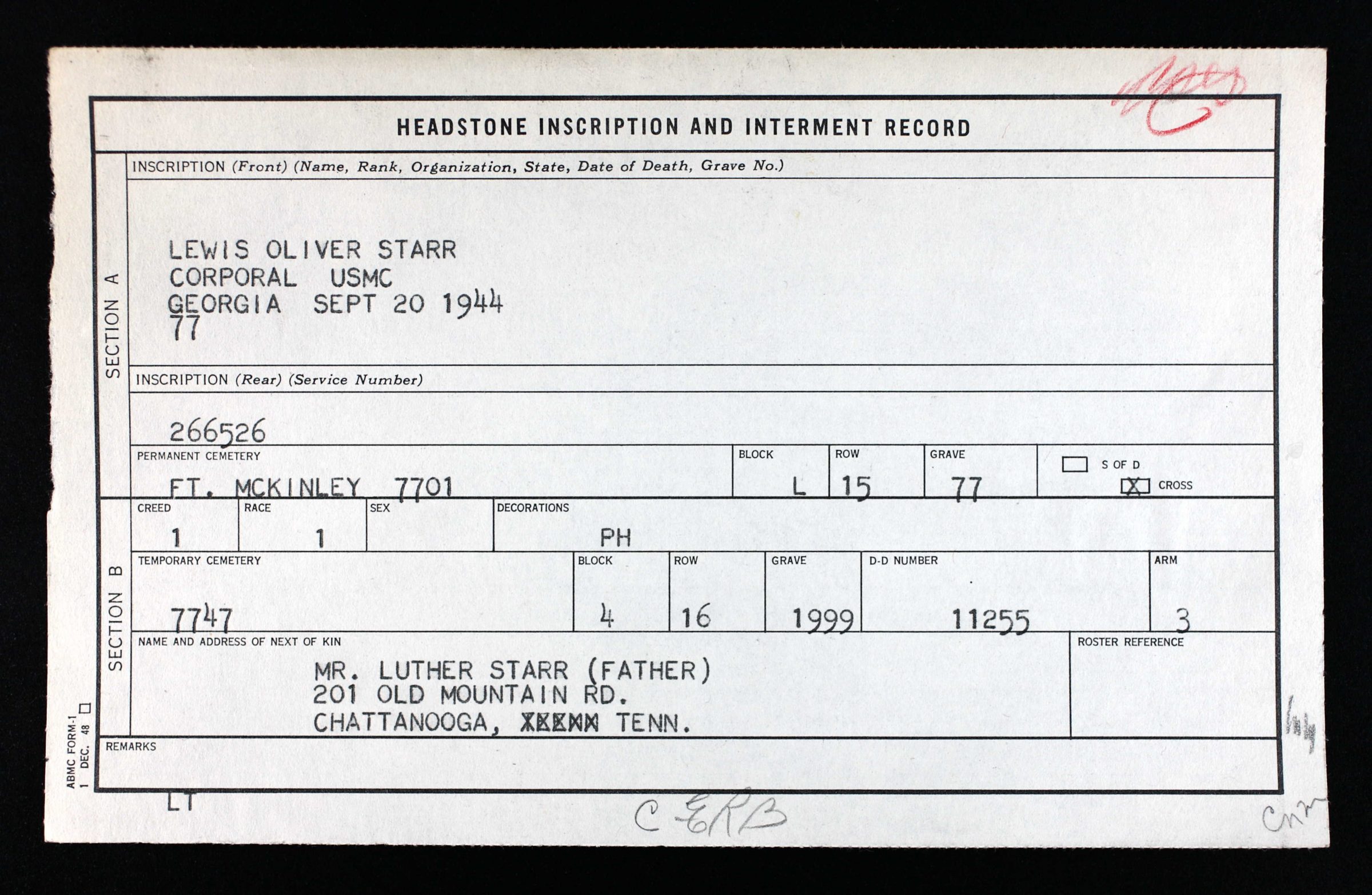 Lewis Oliver Starr was born in Georgia in 1921, the son of Luther Starr and Sudie B. Lewis. He was reared in Savannah, Georgia and was well known in Chattanooga. He entered the service from Georgia.