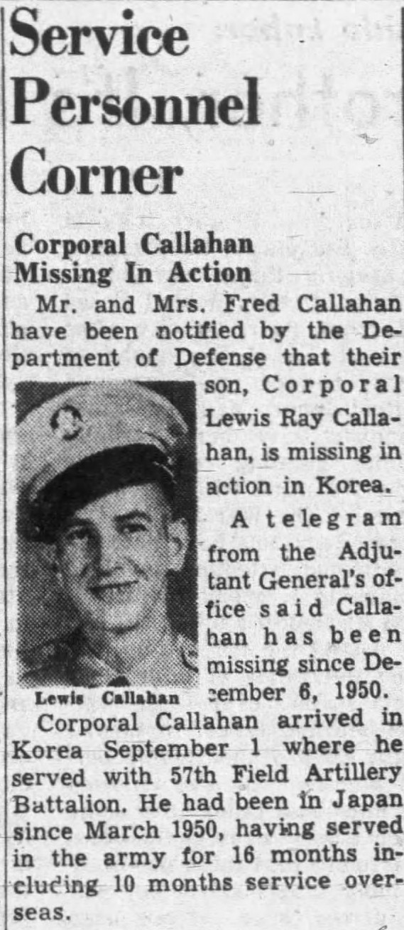 Mr. and Mrs. Fred Callahan have been notified by the Department of Defense that their son, Corporal Lewis Ray Callahan, is missing in action in Korea. A telegram from the Adjutant General’s office said Callahan has been missing since December 6, 1950. Corporal Callahan arrived in Korea September 1 where he served with 57th Field Artillery Battalion. He had been in Japan since March 1950, having served in the army for 6 months including 10 months service overseas.