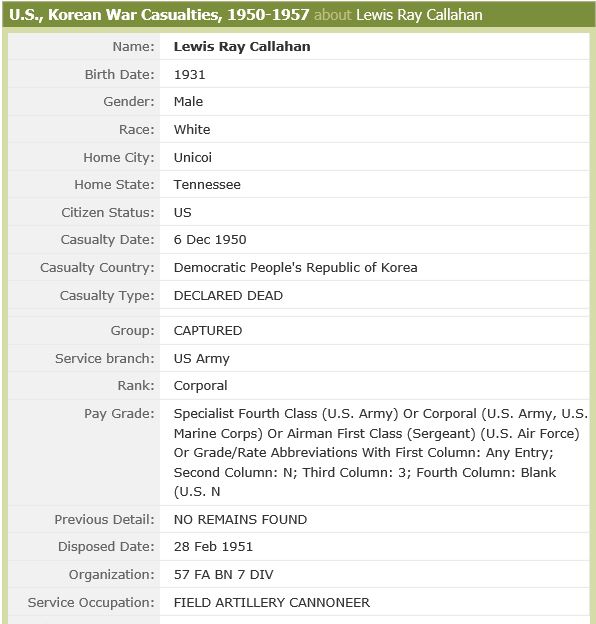 Sergeant Lewis Ray Callahan was a member of Battery B, 57th Field Artillery Battalion, 7th Infantry Division. He was taken prisoner of war while fighting the enemy near Hagaru, North Korea on December 6, 1950 and died while a prisoner of war. His remains were not recovered. His name is inscribed on the Courts of the Missing at the Honolulu Memorial.