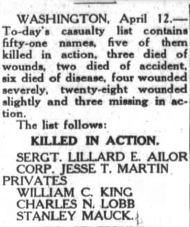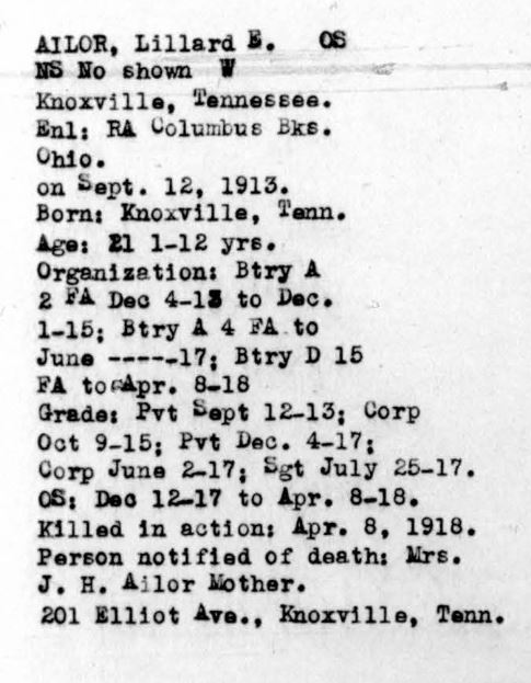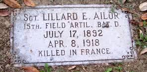 Lillard Earle Ailor was killed in Verdun, France. He was the first Knoxvillian killed in World War I. He was the son of John Harrison Ailor and Lucy Sharp. Ailor Avenue, between Fort Sanders and Mechanicsville, is named for him.