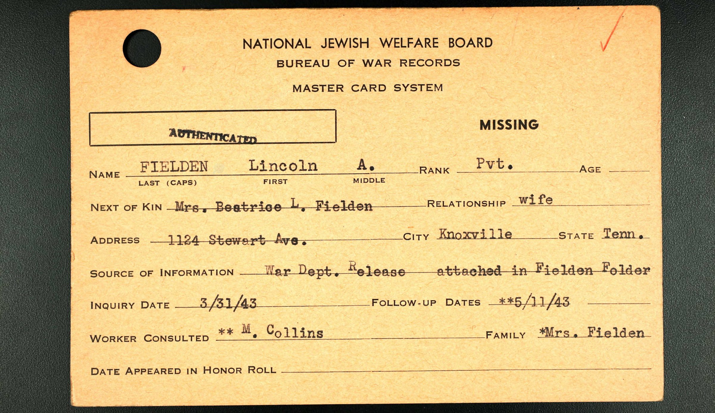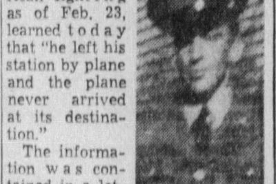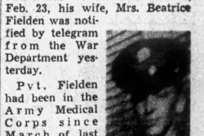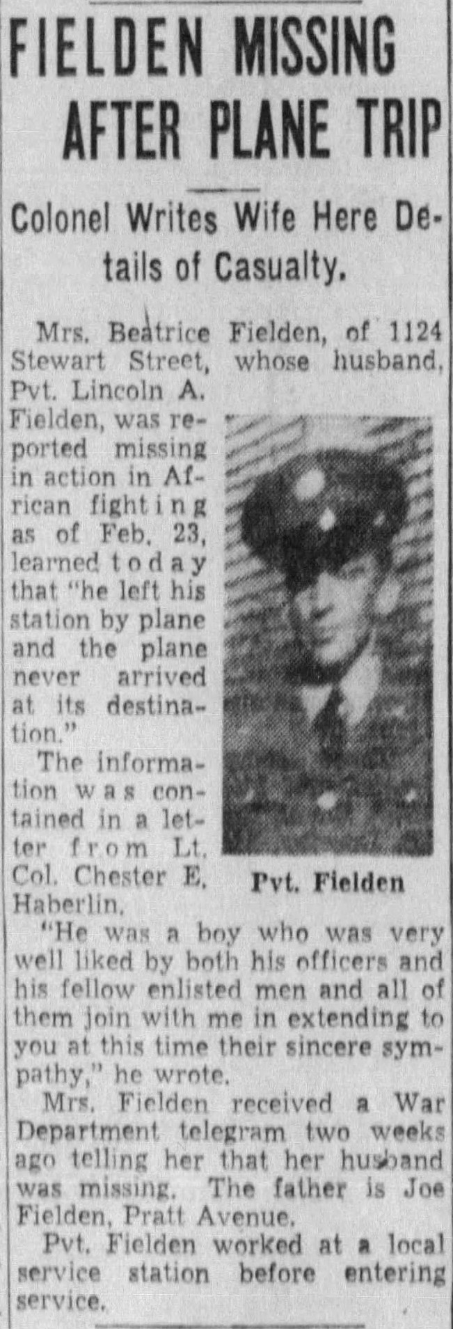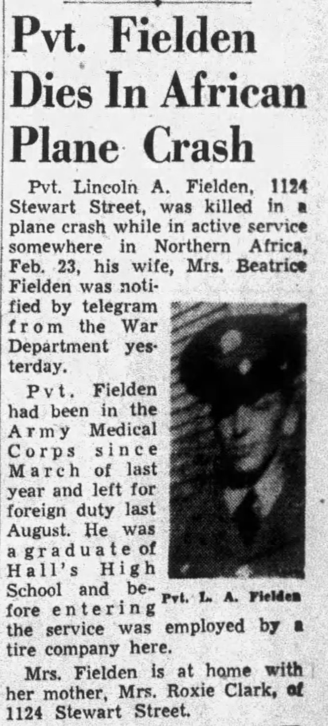 Pvt. Lincoln A. Fielden, 1124 Stewart Street, was killed in a plane crash while in active service somewhere in Northern Africa, Feb. 23, his wife, Mrs. Beatrice Fielden was notified by telegram from the war Department yesterday. Pvt. Fielden had been in the Army Medical Corps since March of last year and left for foreign duty last August. He was a graduate of Hall’s High School and before entering the service was employed by a tire company here. Mrs. Fielden is at home with her mother, Mrs. Roxie Clark, of 1124 Stewart Street.