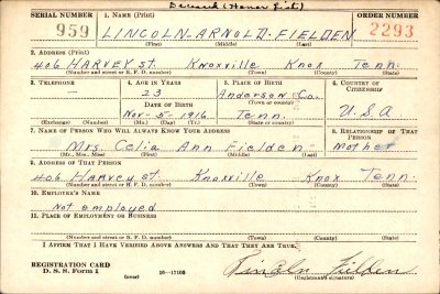 Lincoln Arnold Fielden was born in Anderson County, Tennessee, son of Joseph M. Fielden amd Celia Ann Atkins. He was the husband of Beatrice Clark. He enlisted 6 March 1942 in Fort Oglethorpe, Georgia.
