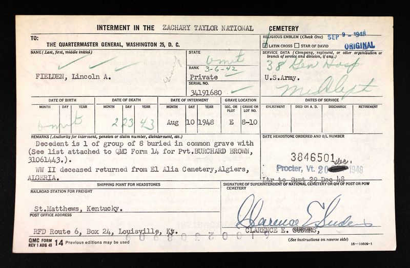 Lincoln Fielden was returned from El Alia Cemetery, Algiers, Algeria on 10 August 1948. He was one of a group of eight buried in a common grave at Zachary Taylor National Cemetery, Louisville, Kentucky.