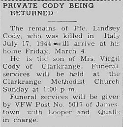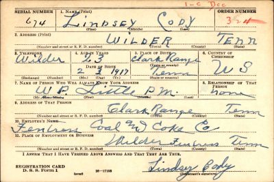 Lindsey Cody was born on 3 February 1917 at Clark Range, Tennessee, the son of Vergil Cody and Arizona “Zona” Hill. He married Bernice Shepard in 1941