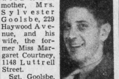 Double funeral services for two brothers killed in action while serving in the U.S. Armed forces in 1944 will be held at National Cemetery. They are Pfc. Arthur Luttrell Goolsbe and Sgt. Lloyd Clarence Goolsbe. Pfc. Goolsbe was killed July 27, 1944, while serving in France with the 117th Infantry, 30th Division. Sgt. Goolsbe was killed Feb. 22, 1944, in the Marshall Islands, while he was with the U.S. Marines. Both are sons of Mrs. Sylester (Lila) Goolsbe, 229 Haywood Avenue. The bodies were returned here and are at Roberts Funeral Home.