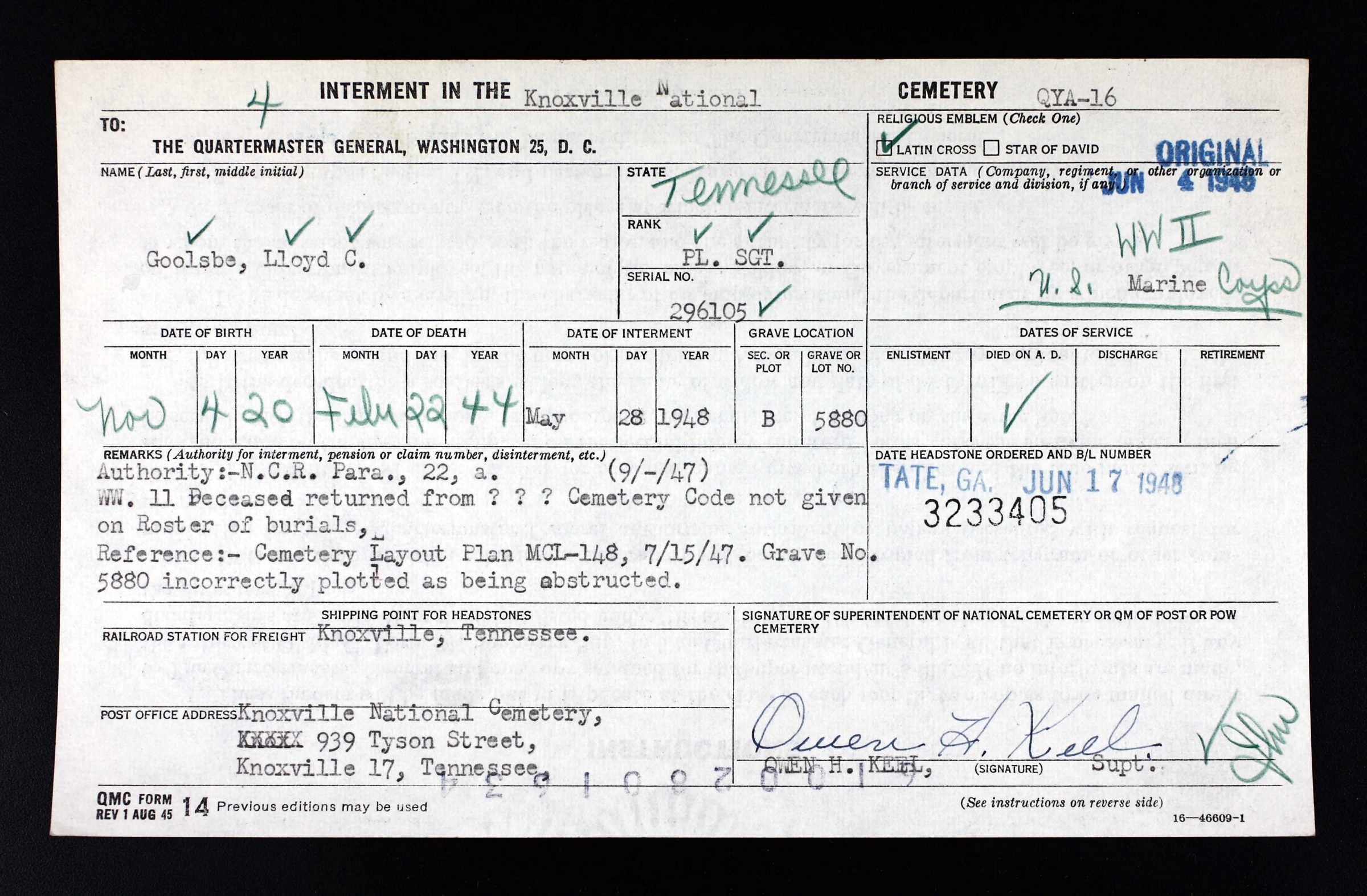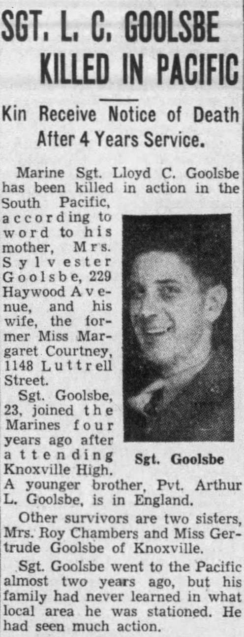 Marine Sgt. Lloyd C. Goolsbe has been killed in action in the South Pacific, according to his mother, Mrs. Sylvester Goolsbe, 229 Haywood Avenue, and his wife, the former Miss Margaret Courtney, 1148 Luttrell Street. Sgt. Goolsbe, 23, joined the Marines four years ago after attending Knoxville High. A younger brother, Pvt. Arthur L. Goolsbe, is in England. Other survivors are two sisters, Mrs. Roy Chambers and Miss Gertrude Goolsbe of Knoxville. Sgt. Goolsbe went to the Pacific almost two years ago, but his family had never learned in what local area he was stationed. He had seen much action.