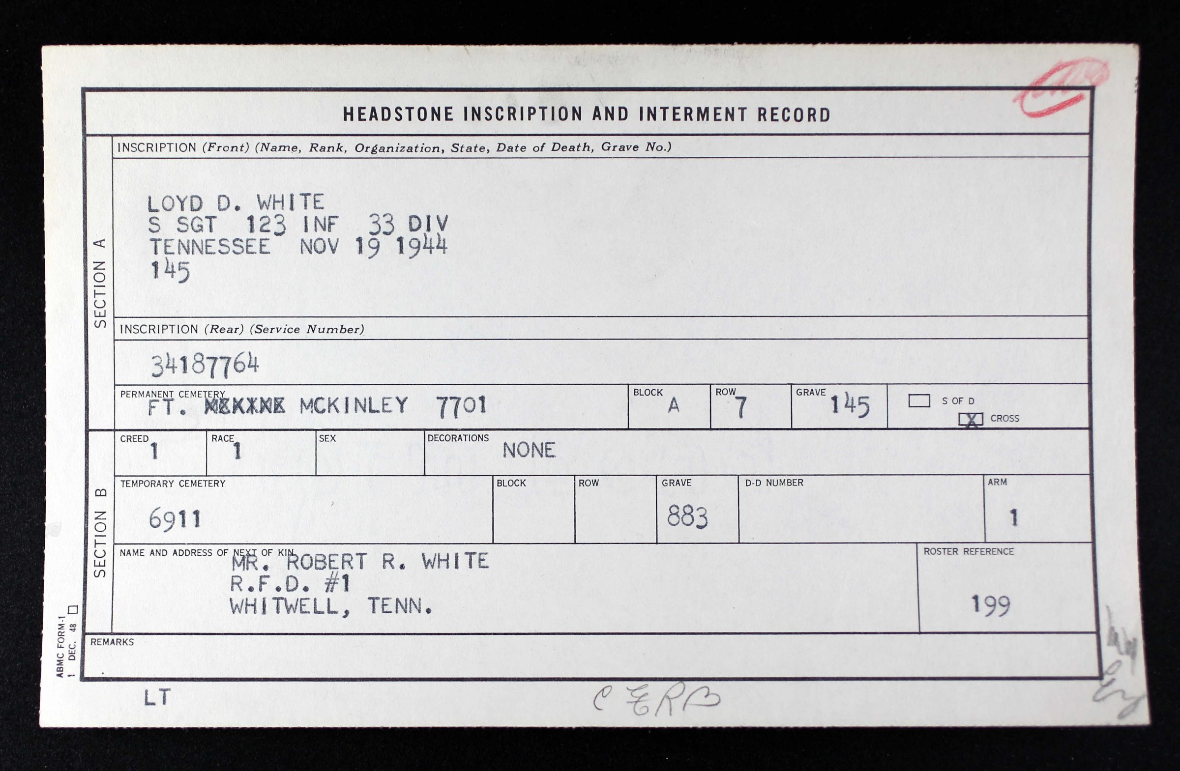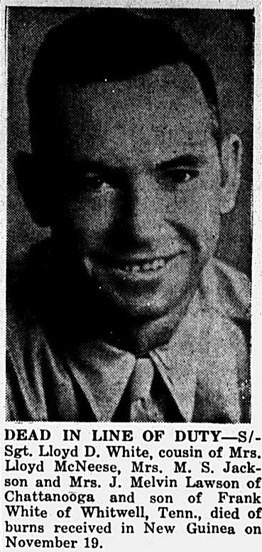 Dead in line of duty – S/Sgt. Lloyd D. White, cousin of Mrs. Lloyd McNeese, Mrs. M.S. Jackson and Mrs. J. Melvin Lawson of Chattanoooga and son of Frank White of Whitwell, Tenn., died of burns received in New Guinea on November 19.