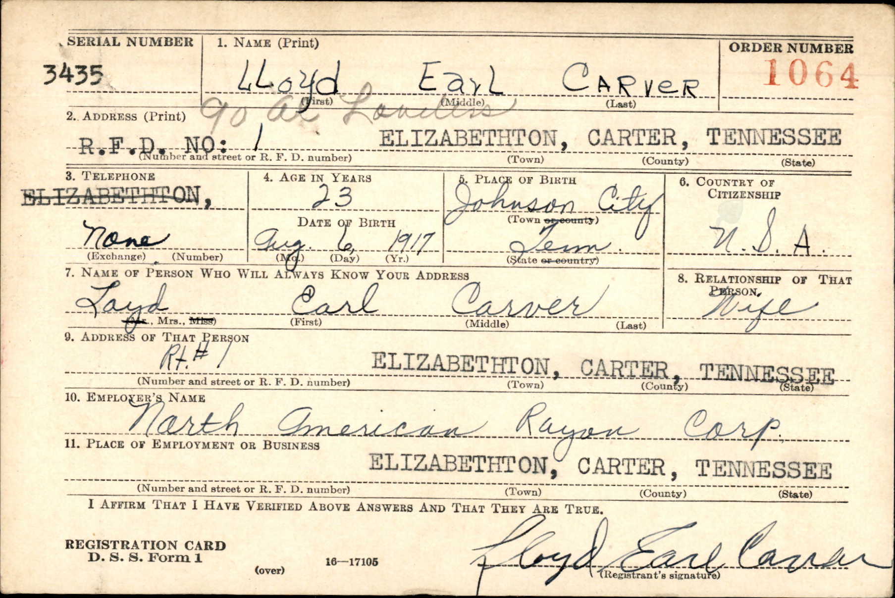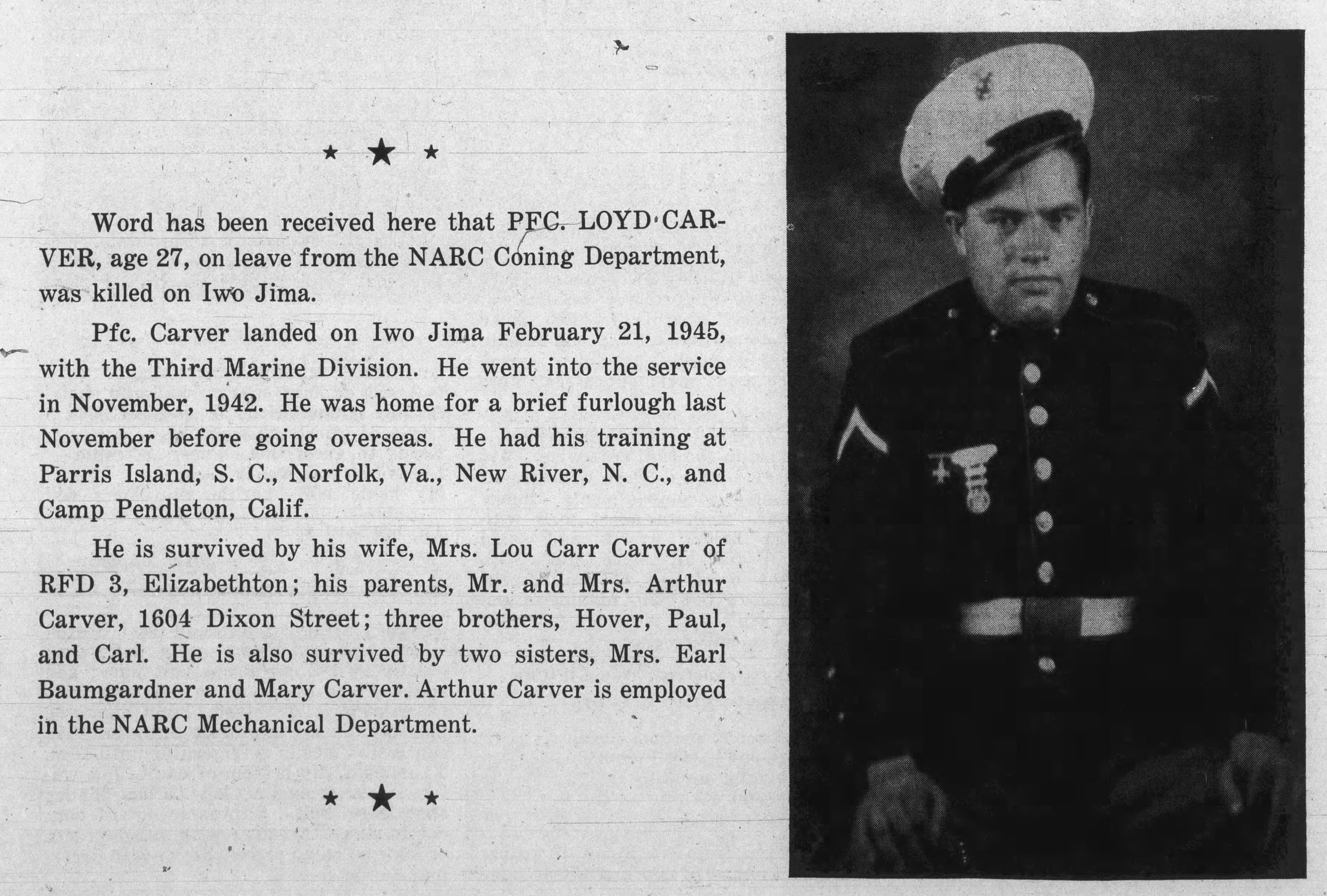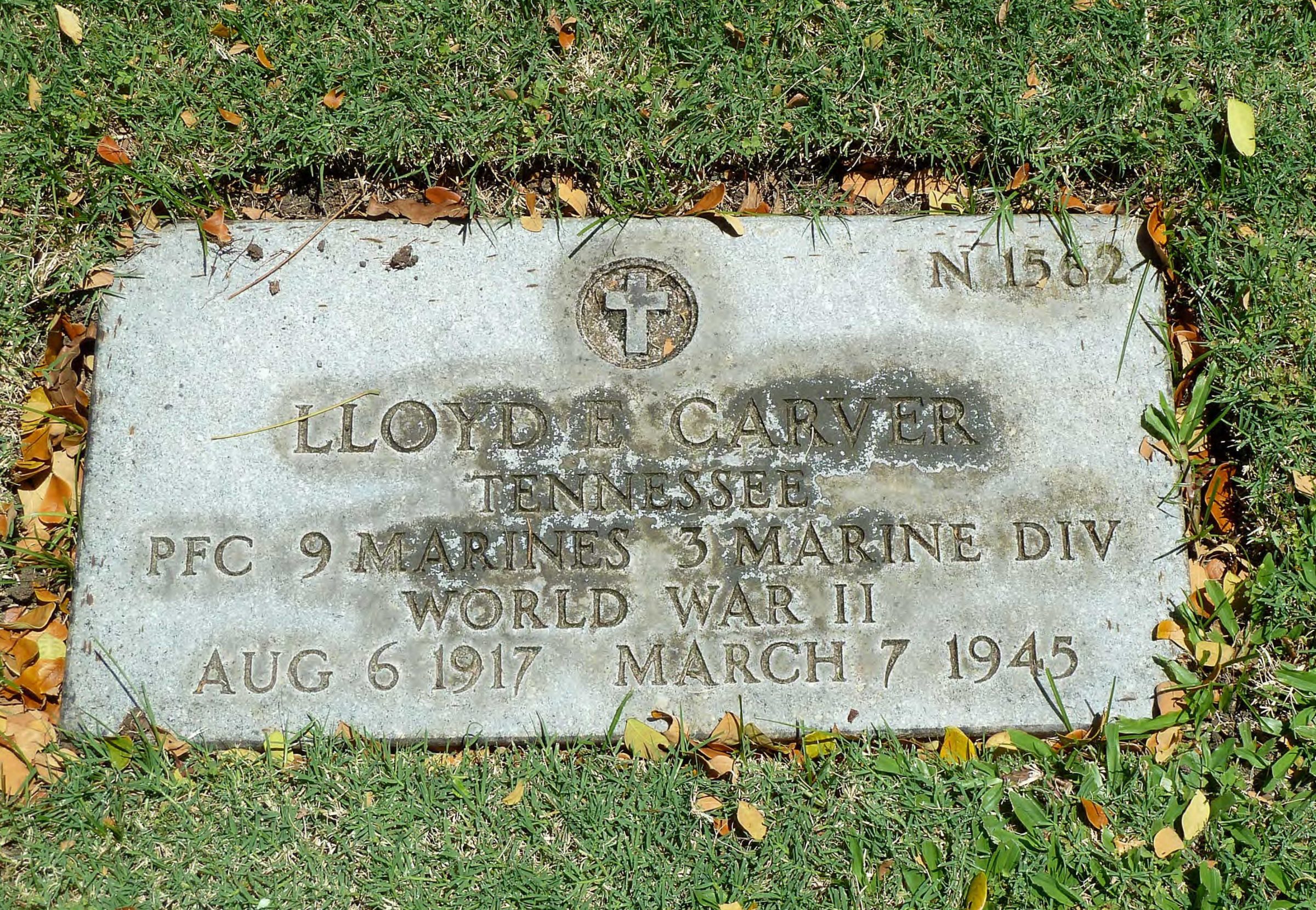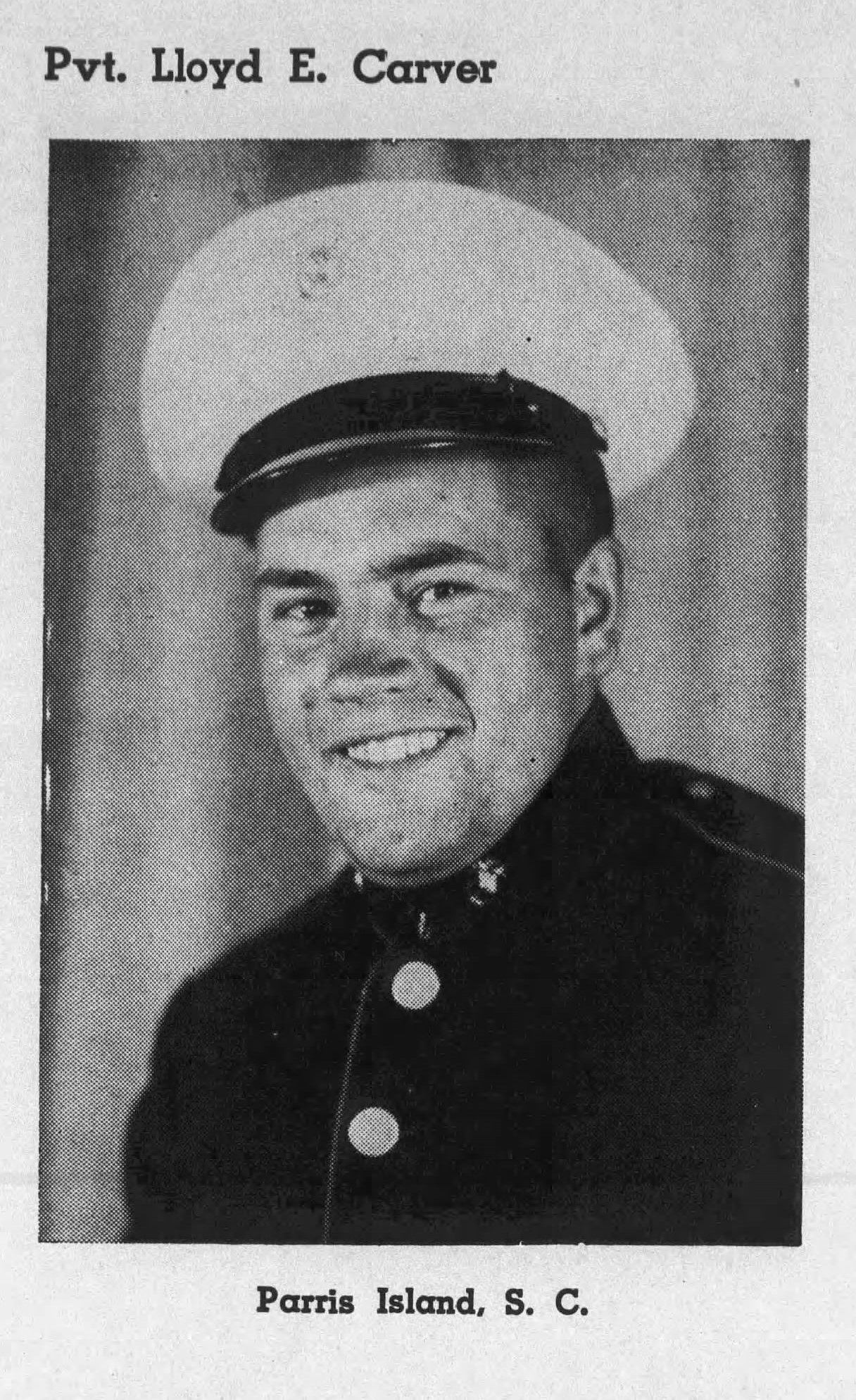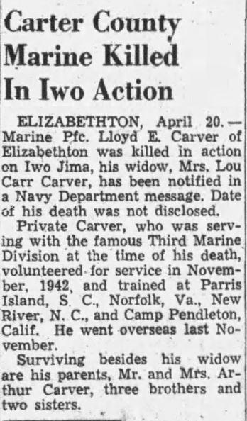 Lloyd Earl Carver was born at Johnson City, Tennessee, the son of Arthur (Britt) Carver and Roxie Ann Smith. He married Miss Lou Carr in 1944. Private Carver was employed by the North American Rayon corporation before entering the United States Marine Corps in 1941. He trained at Parris Island, South Carolina, Norfolk in Virginia, New River in North Carolina and Camp Pendleton, California. He went overseas in November, 1944. He was survived by his widow, parents, three brothers and two sisters.