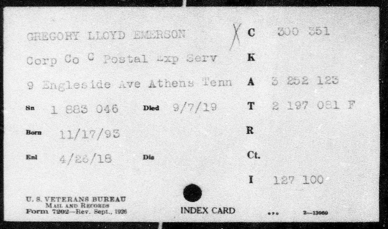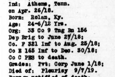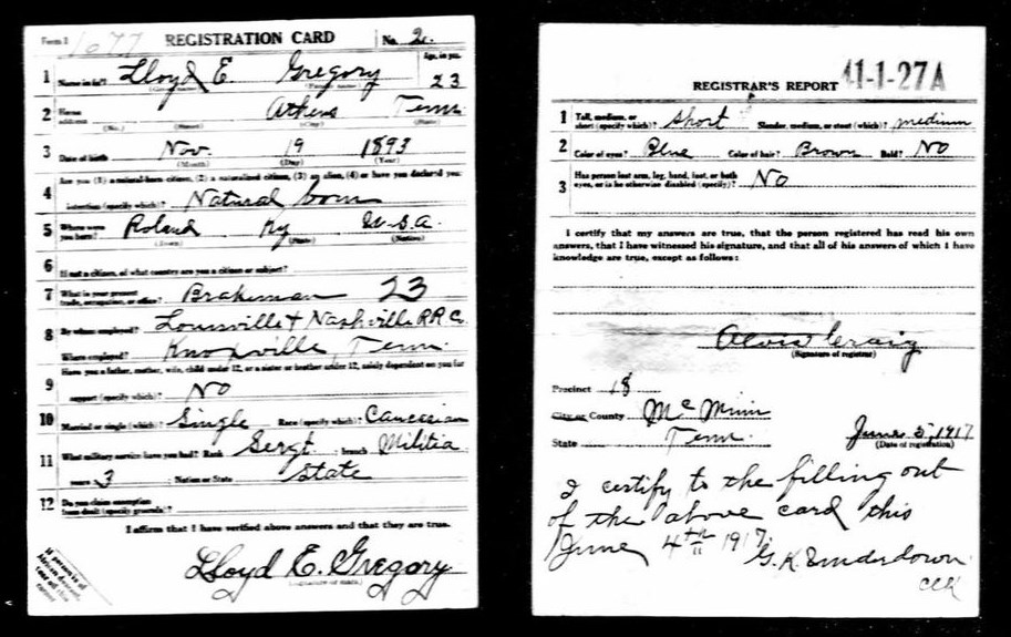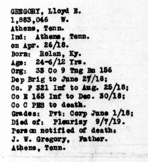 Lloyd Emerson Gregory was born 19 November 1893 in Rowland, Kentucky, son of James William Gregory and Martha Ellen Miller. He died of pleurisy September 7, 1919 at the U.S.A.General Hospital 41 in New York City, Richmond, New York.