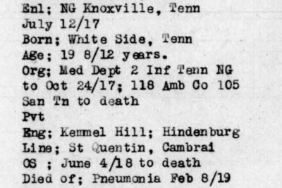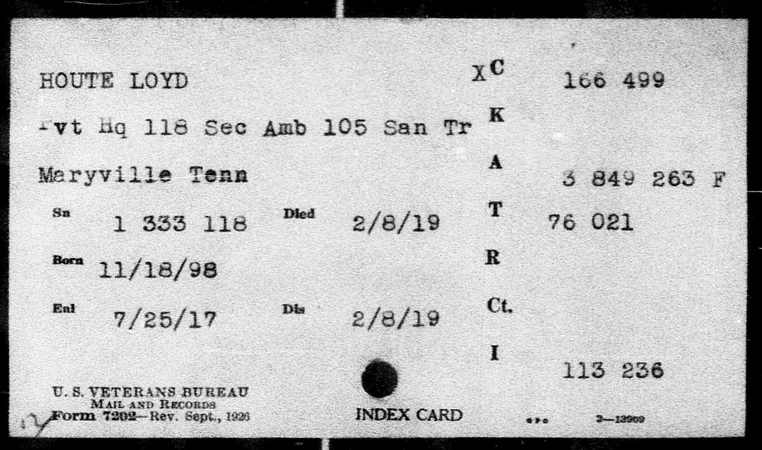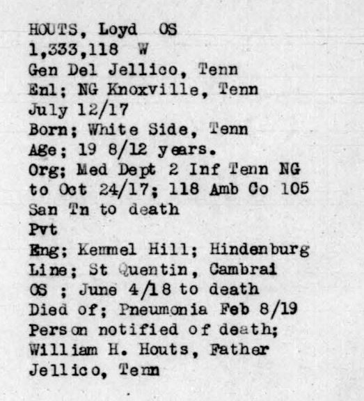 Loyd (also Lloyd) Houts was born in White Side, Tennessee, son of William H. and Effie Houts. He served with the 105th Sanitary Trains, 30th Division. He died of pneumonia on 8 February 1919 at the age of 19. He is buried plot D, row 17, grave 38, Oise Aisne American Cemetery, Fère-en-Tardenois, France.