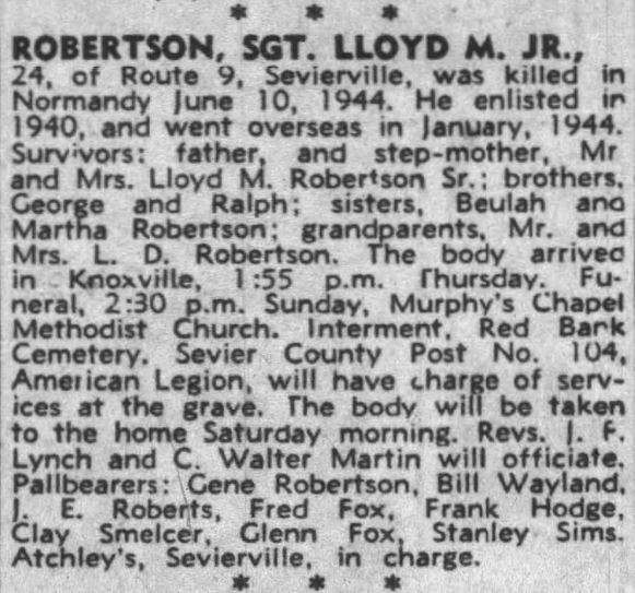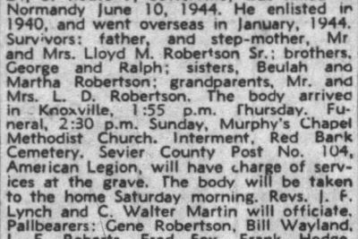 Lloyd Robertson participated in D-Day but was killed soon after on 10 June 1944 near Ste-Marie-Du-Mont, France. He is buried at Red Bank Cemetery, Richardson Cove, Sevier County, Tennessee.
