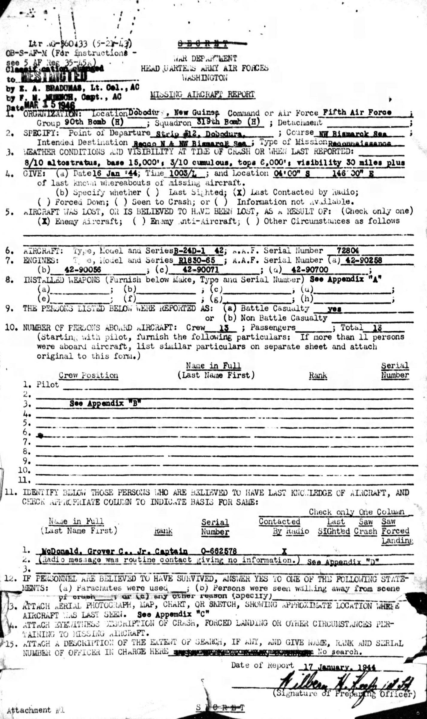 Aircraft B-24D-1 with serial number 42-72804 departed from Strip #12 Dobodura, New Guinea on a reconnaissance mission to Recco N&NW Bismarck Sea. The aircraft was shot down over the Bismarck Sea.