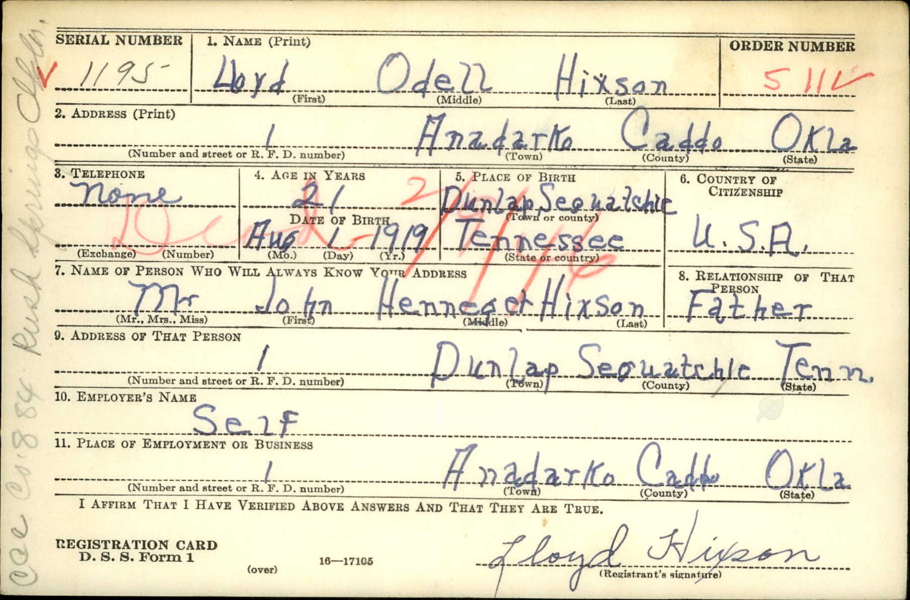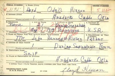 Lloyd Odell Hixson was born in Dunlap Sequatchie, Tennessee, the son of John Hennigar Hixson and Lilla Ethel King. He resided with his causin and his wife, Arnold and Ada Mae King in Abadarko, Oklahoma when he entered the service.