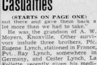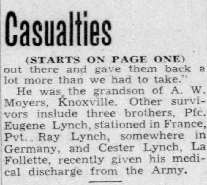 He was the grandson of A.W. Moyers, Knoxville. Other survivors include three brothers, Pfc. Eugene Lynch, stationed in France, Pvt. Ray Lynch, somewhere in Germany, and Cester Lynch, La Follette, recently given his medical discharge from the Army.