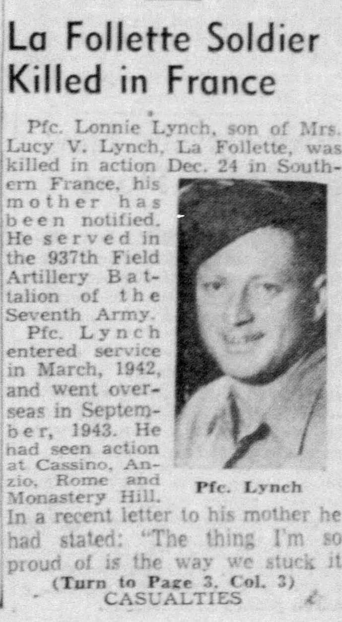 Pfc. Lonnie Lynch, son of Mrs. Lucy V. Lynch, La Follette, was killed in action Dec. 24 in Southern France, his mother has been notified. He served in the 937th Field Artillery Battalion of the Seventh Army. Pfc. Lynch entered service in March, 1942 and went overseas in September, 1943. He had seen action at Cassino, Anzio, Rome and Monastery Hill. In a recent letter to his mother he had stated: “The thing I’m so proud of is the way we stuck it out there and gave them back a lot more than we had to take.”
