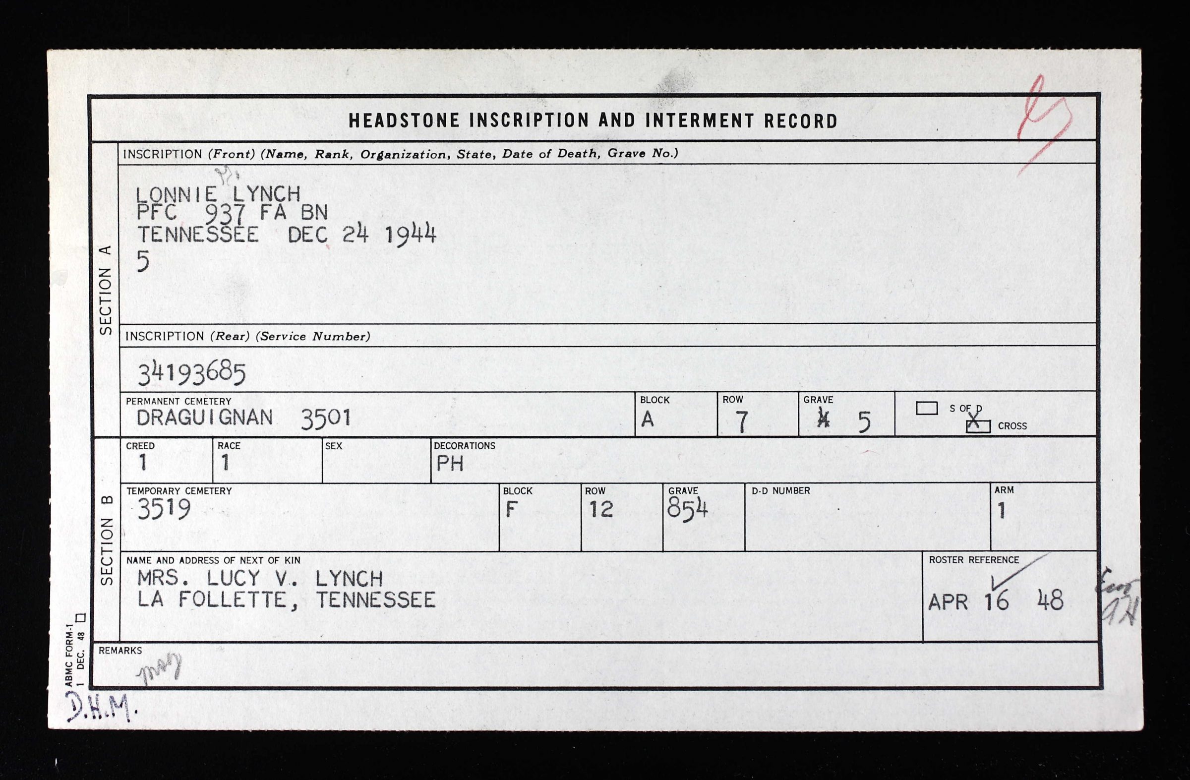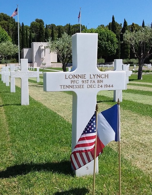 Private First Class Lonnie Lynch enlisted in the US Army on March 20, 1942 at Fort Oglethorpe, Georgia. He had attended grammar school and was not married at the time he entered the Army. He was assigned to the 937th Field Artillery Battalion and was killed in action on December 24, 1944 in France. He is buried at the Rhône American Cemetery and Memorial, Côte d’Azur, Provence-Alpes-Côte d’Azur Region, France.