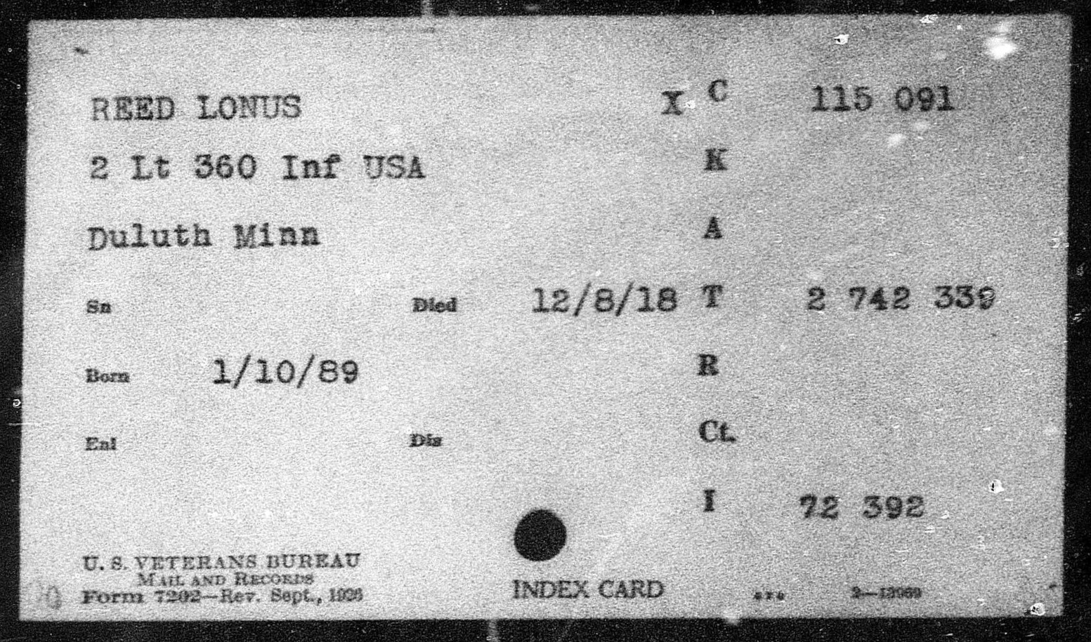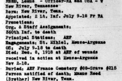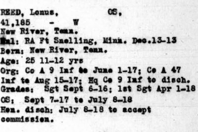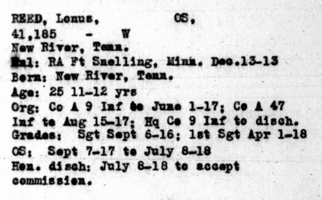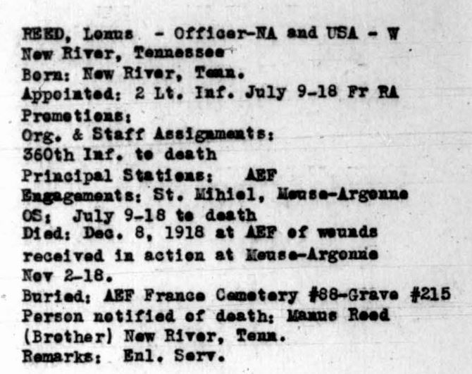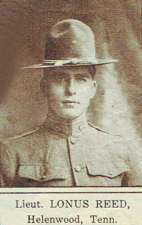 Lonus Reed was born 9 Jan 1889 in New River, Tennessee. He enlisted at Fort Snelling in Minnesota. He was honoroably discharged as Sergeant First Class on 8 July 1918 to accept commission as Second Lieutenant on 9 July 1918 in France. He died of wounds received in action at Meuse-Argonne, France on 8 Dec 1918 at the age of 25. He was initially buried at the AEF France Cemetery #88, Grave 215. He is buried at the Black Creek Crossroads Cemetery, Black Creek, Scott County, Tennessee.