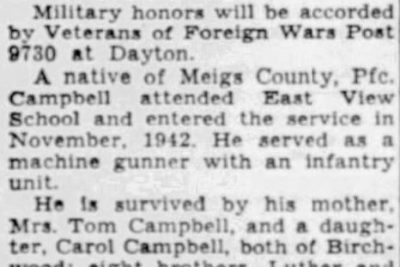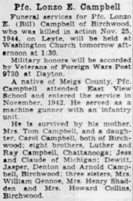 Funeral services for Pfc. Lonzo E. (Bill) Campbell of Birchwood, who was killed in action Nov. 25, 1944, on Leyte, will be held at Washington Church. A native of Meigs County, Pfc. Campbell attended East View School and entered the service in November, 1942. He served as a machine gunner with an infantry unit. He is survived by his mother, Mrs. Tom Campbell, and a daughter, Carol Campbell, both of Birchwood; eight brothers, Luther and Ray Campbell, Chattanooga; Jess and Claude of Michigan; Dewitt, Jasper, Denton and Arnold Campbell, Birchwood; three sisters, Mrs. William Gennoe, Mrs. Henry Shadden and Mrs. Howard Collins, Birchwood.