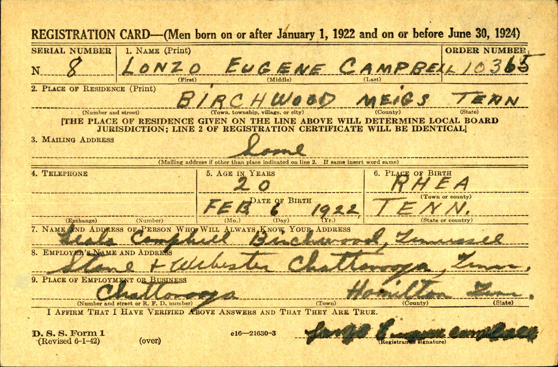 Lonzo Eugene Campbell was born on 6 February 1922 in Rhea, Tennessee. He was the son of John Thomas Campbell and Minnie Elizabeth Coxey. He was married to Leola Campbell and father of Carol Campbell.