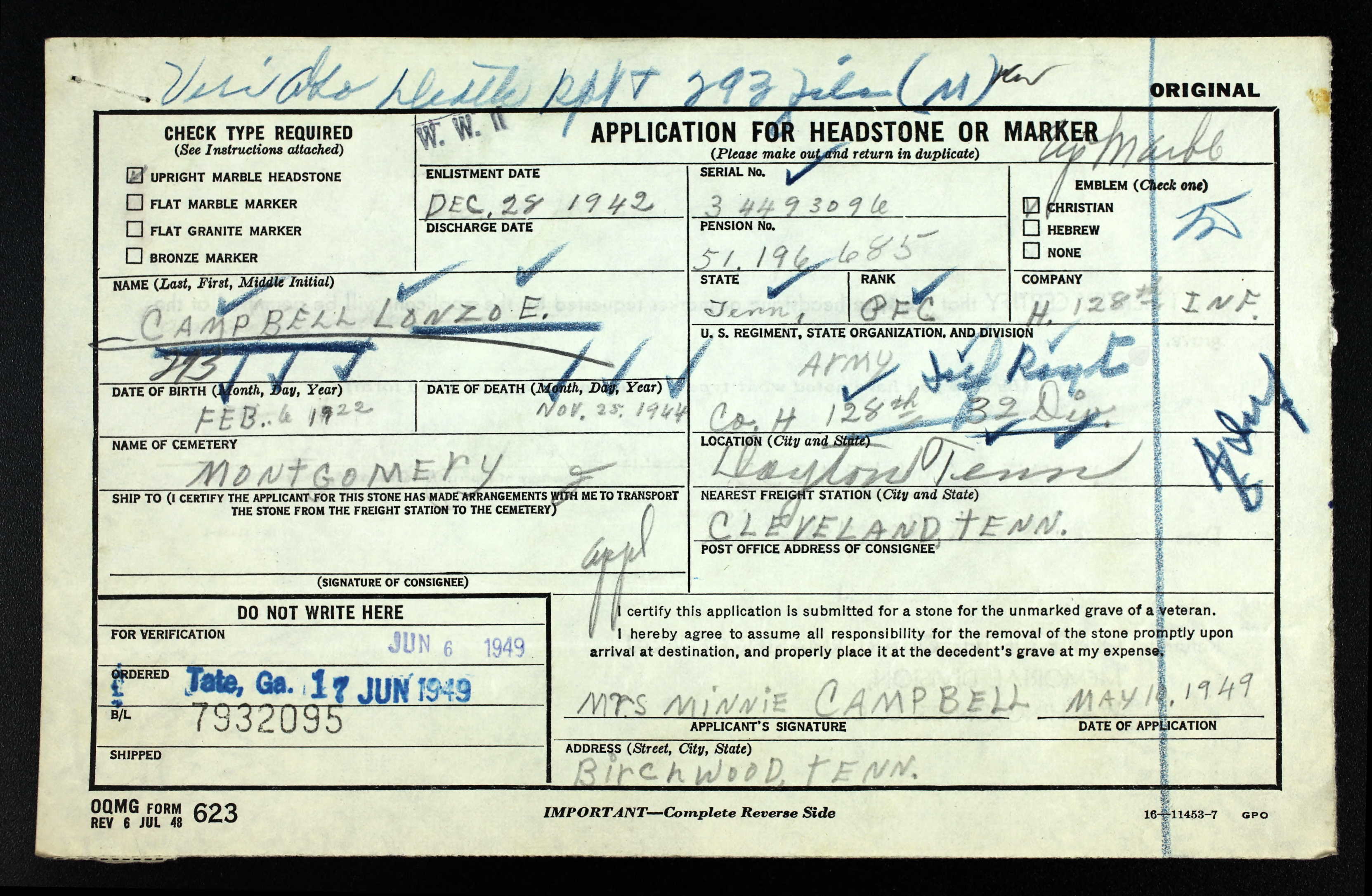 Lonzo Campbell enlisted 14 November 1942 – Fort Oglethorpe, Georgia. He served with the 128th Infantry Regiment, 32nd Infantry Division, Company H. He was killed during the battle of Leyte on 25 November 1944, during combat in the Ormoc Valley.