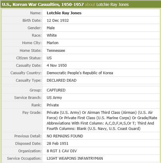 Nashville– Tennessee Gov. Bill Haslam and Department of Veterans Affairs Commissioner Many-Bears Grinder recognize the service and sacrifice of Private First Class Lotchie John Ray Jones of Jasper. Jones went missing on or about November 2, 1950 in the vicinity of Unsan, North Korea and is believed to have died while in enemy captivity at the Pyoktong Prisoner of War Camp 5 on February 28, 1951. The Marion County native was serving with “B” Company, 1stBattalion, 8th Cavalry Regiment, 1st Cavalry Division during the Korean War when he went missing. He was 17 years old.