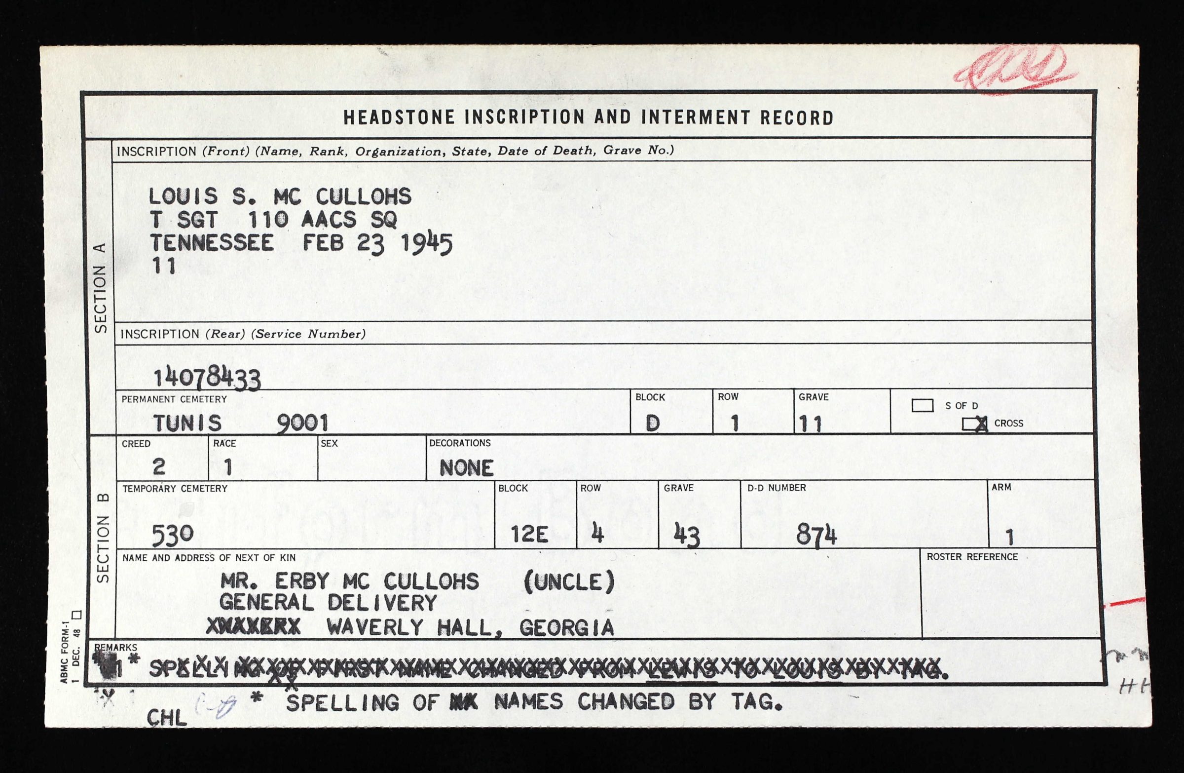 Louis S. McCullohs enlisted on 27 January 1942 at Fort Oglethorpe in George. He Died non Battle.