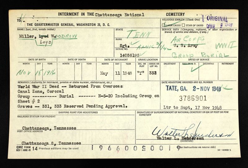 Sgt Miller died at the Canal Zone, Corozal. He is buried together with Private Albert W. Anderson, Sergeant William R. Coulter Jr., Staff Sergeant Thomas J. Drummond Jr., Second Lieutenant Robert L. Forrester Jr., Second Lieutenant Anselm B. Harrison, Sergeant Charles J. Korpi, Master Sergeant Paul Knoppke, Second Lieutenant Richard E.A. Regula, First Lieutenant William R. Ussery, Jr. and Staff Sergeant Harold W. Woodcock.