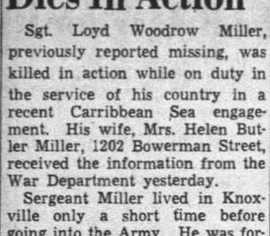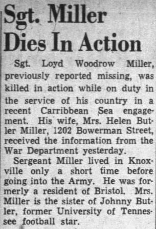 Sgt. Loyd Woodrow Miller, previously reported missing, was killed in action while on duty in the service of his country in a recent Carribbean Sea engagement. His wife, Mrs. Helen Butler Miller, 1202 Bowerman Street, received the information from the War Department yesterday. Sergeant Miller lived in Knoxville only a short time before going into the Army. He was formerly a resident of Bristol. Mrs. Miller is the sister of Johnny Butler, former University of Tennessee football star.