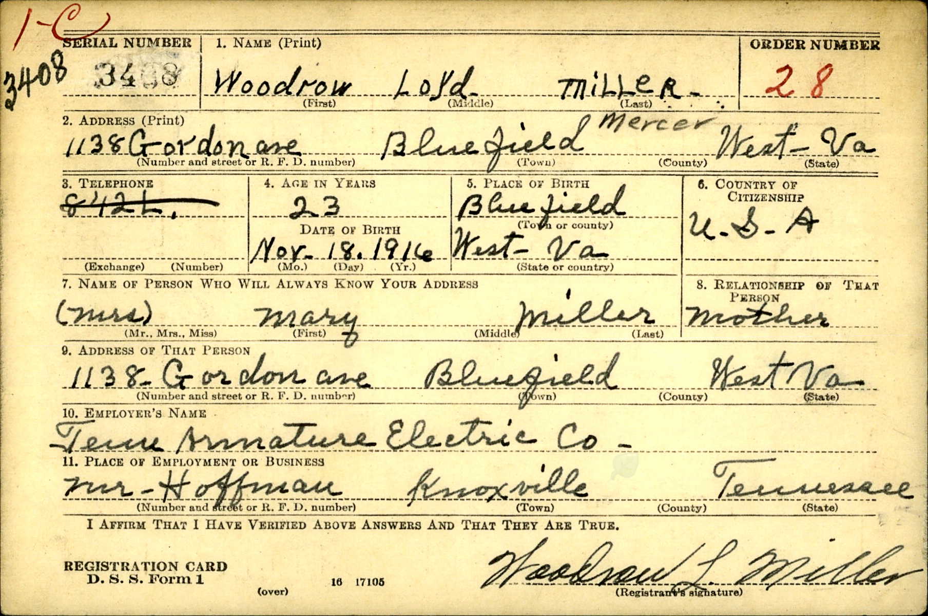 Loyd Woodrow Miller was born on 18 November 1916, the son of Mary Miller. He graduated from the radio communication and mechanics course at Scott Field in Illinois in October, 1941. After this course he was assigned to duty at MacDill Field, Fla. He married Helen Butler on 14 February 1942 at Chattsworth in Georgia. He was still stationed in Florida at the time.